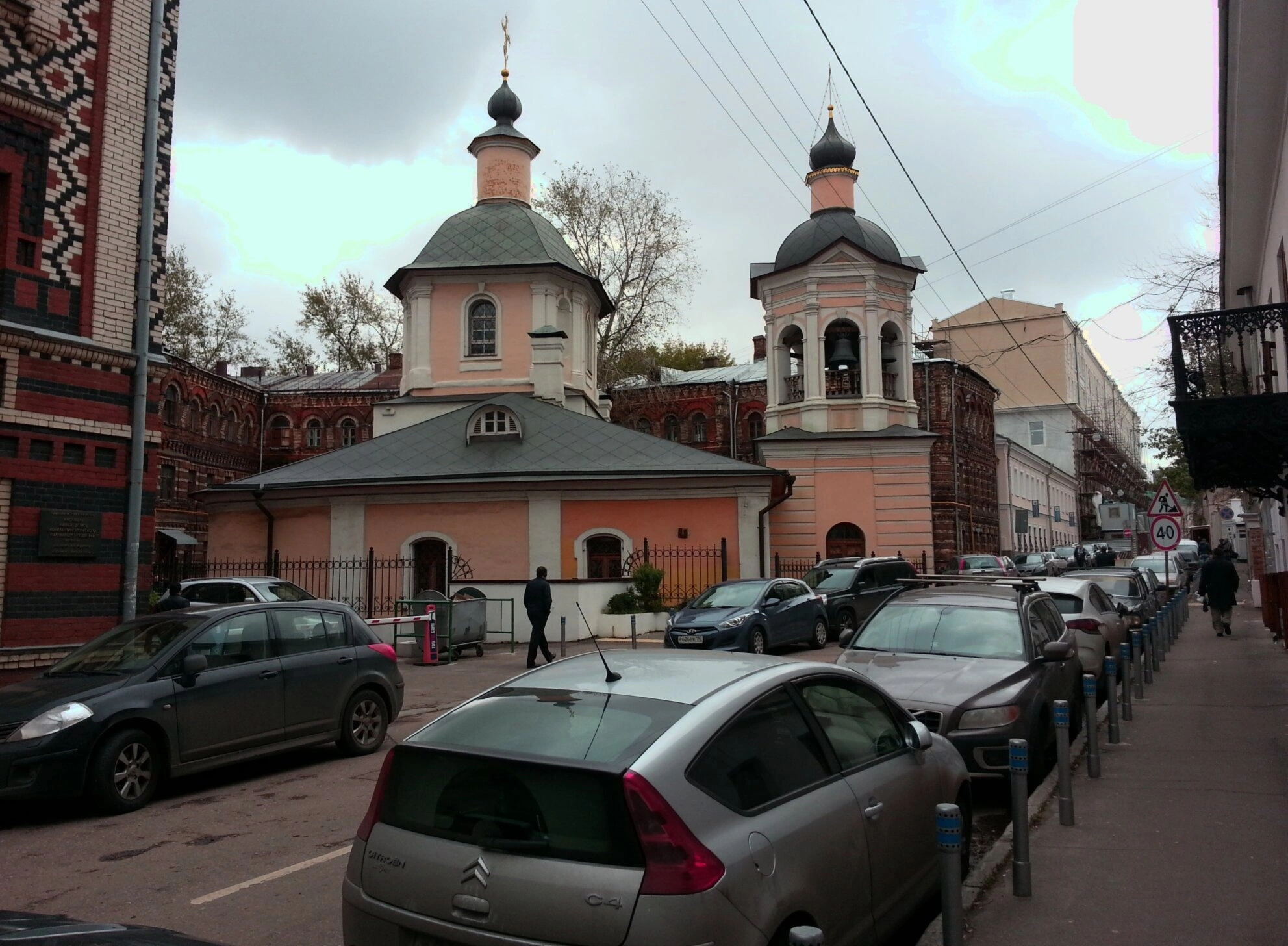 На фотографии также видна городская среда, окружающая храм: припаркованные автомобили, соседние здания, включая строение с кирпичным декором слева. Снимок передаёт атмосферу тихого московского переулка, где древняя святыня гармонично сочетается с современным городским пейзажем.