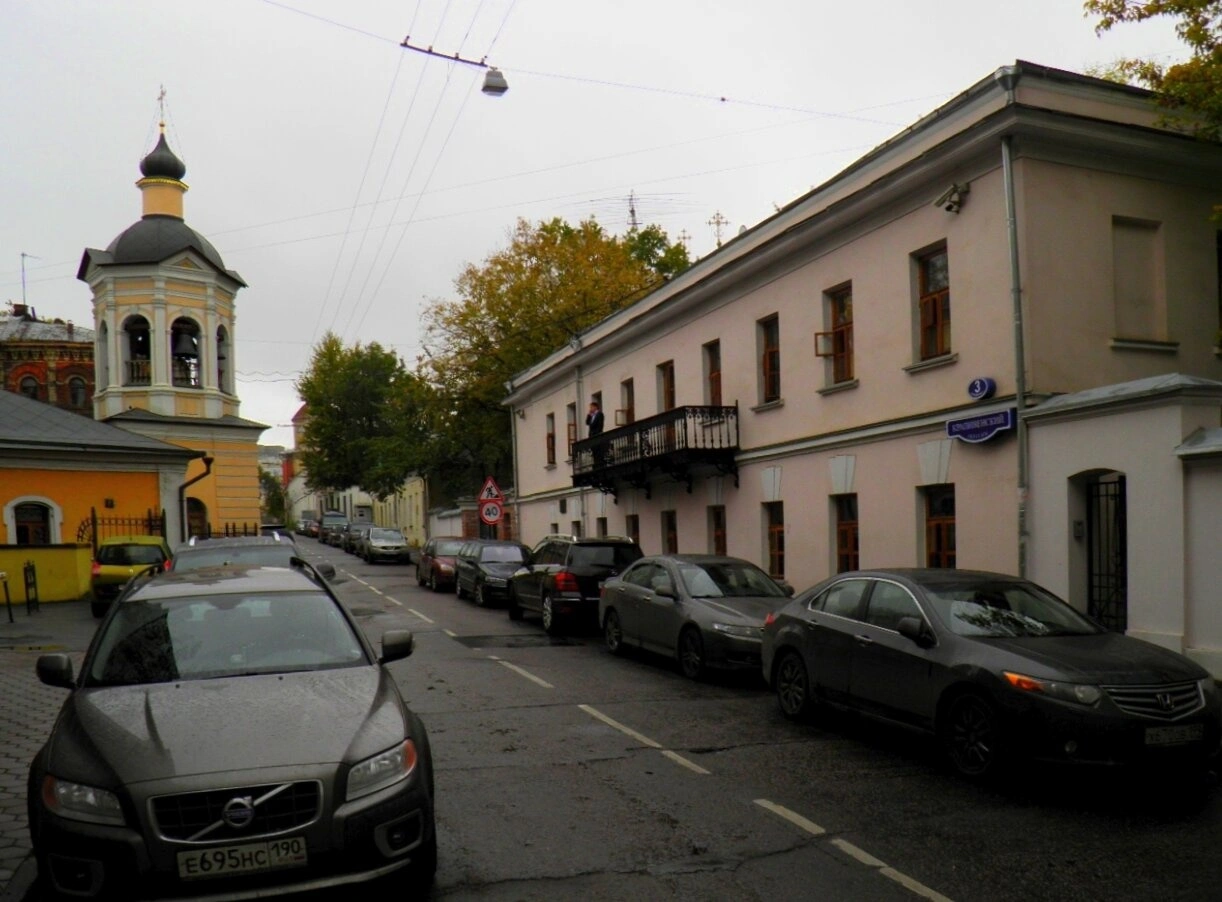 Справа на переднем плане изображено двухэтажное историческое здание, сохранившее характерные элементы застройки старой Москвы. Фасад украшает балкон с коваными элементами, а оконные проемы обрамлены наличниками красного цвета. На стене здания различима табличка с указанием названия переулка и нумерации домов.