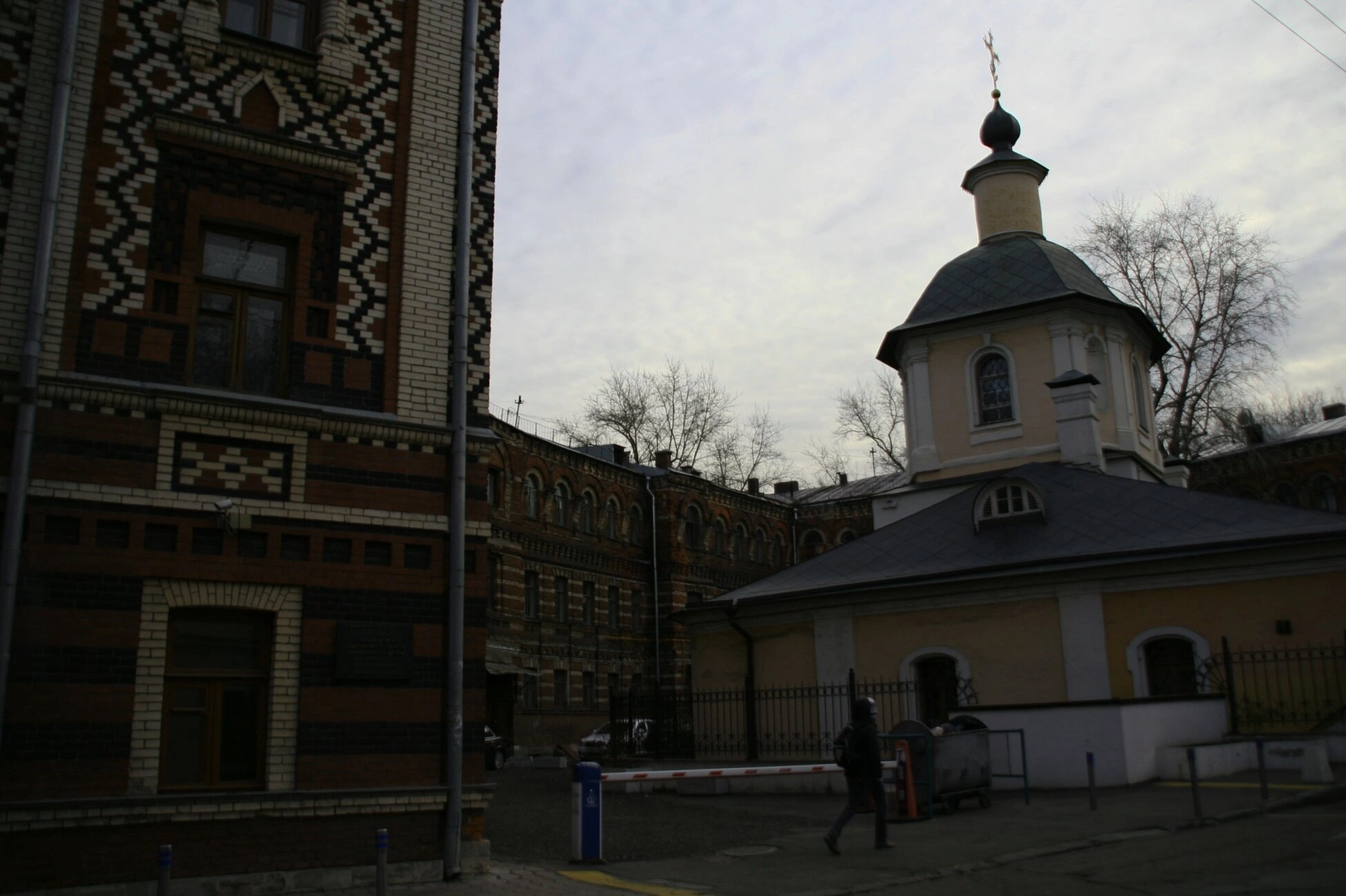На переднем плане фотографии виден шлагбаум и фигура человека, идущего по тротуару. Общая атмосфера снимка передаёт спокойствие и умиротворение, характерные для этого святого места. Пасмурная погода, запечатлённая на фото, создаёт особое настроение, напоминая о вечном и непреходящем.