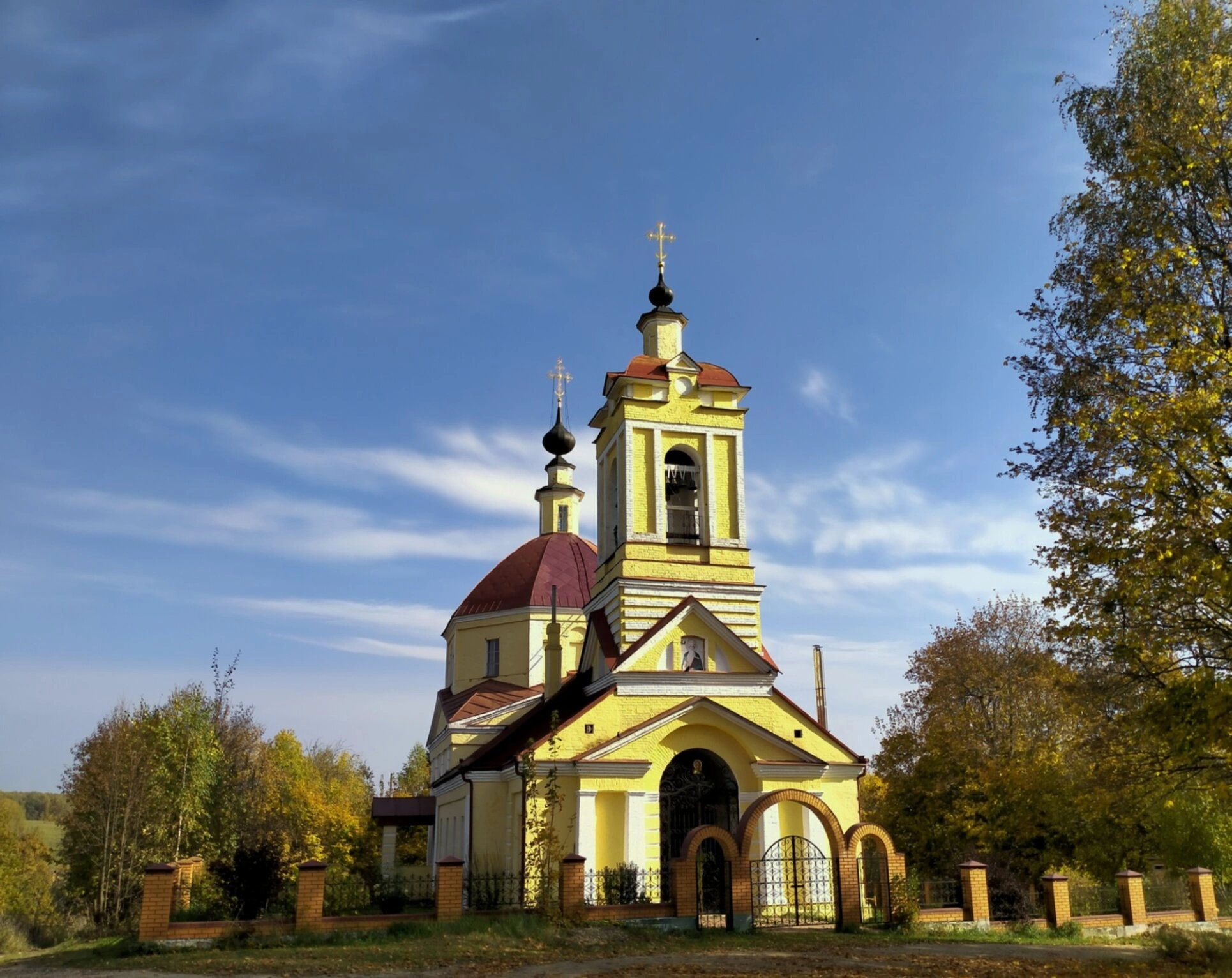 Осеннее убранство окружающего пейзажа добавляет фотографии особого настроения. На переднем плане видны опавшие желтые листья, свидетельствующие о золотой осени. Деревья, окружающие храм, частично сохранили свою листву, создавая живописный фон для церковного сооружения. Небесная высь представлена светлыми облаками на фоне лазурного неба, что указывает на ясную погоду в день съемки.