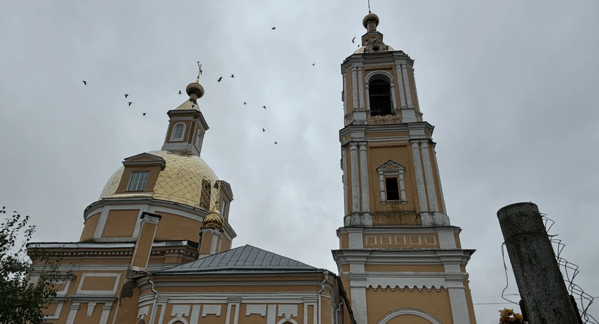 На фотографии запечатлён вид на храм с некоторого расстояния, что позволяет оценить его архитектурные достоинства и текущее состояние. На заднем плане видно пасмурное небо с летящими птицами, что создаёт особое настроение и подчёркивает скромное величие этого духовного места.