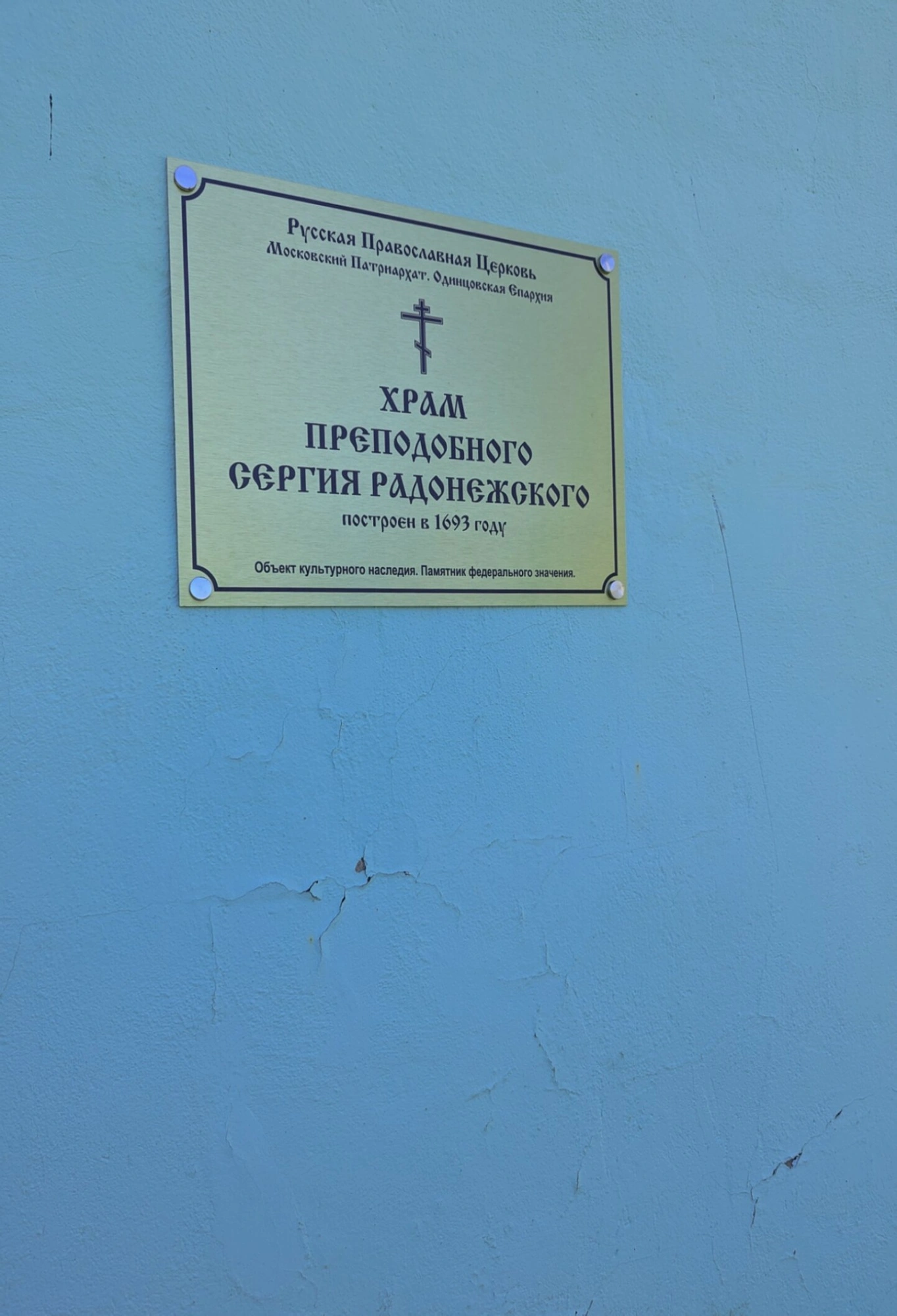 На фотографии запечатлена информационная табличка, установленная на стене православного храма Преподобного Сергия Радонежского, расположенного в селе Могутово Наро-Фоминского района Московской области. Мемориальная доска содержит основные сведения о святыне: указано, что храм принадлежит Русской Православной Церкви Московского Патриархата в составе Одинцовской епархии.