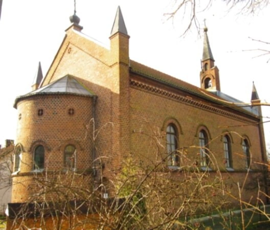 Архитектурный облик храма, выполненного из красного кирпича, являет собой пример неоготического стиля, характерного для культовых построек Восточной Пруссии. Высокие стрельчатые окна, стройная колокольня и лаконичный декор создают образ, устремлённый ввысь, к горнему миру. На переднем плане снимка видны ветви деревьев, что подчёркивает гармоничное вписывание святого места в природный ландшафт косы.