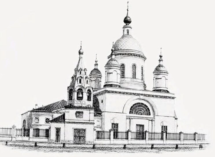 Графическая техника исполнения позволяет детально передать архитектурное своеобразие храма, подчеркнуть строгость линий и гармонию пропорций. Изображение выполнено с высоким мастерством, что позволяет рассмотреть все элементы церковного здания в их первозданной красоте.