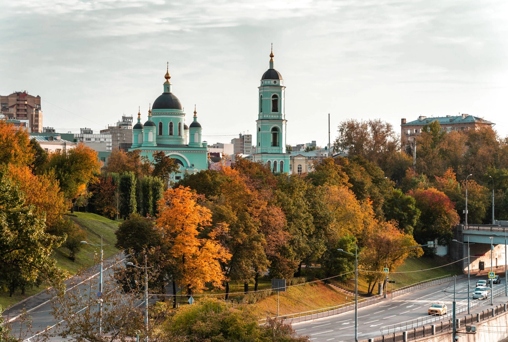 На переднем плане фотографии видна оживленная городская магистраль, подчеркивающая современный контекст бытия древней святыни. По сторонам от храма виднеются многоэтажные жилые здания, что свидетельствует о неразрывной связи духовной жизни и повседневности столицы. Небесный свод, частично покрытый облаками, мягко освещает весь архитектурный ансамбль, придавая изображению особую глубину и одухотворенность.