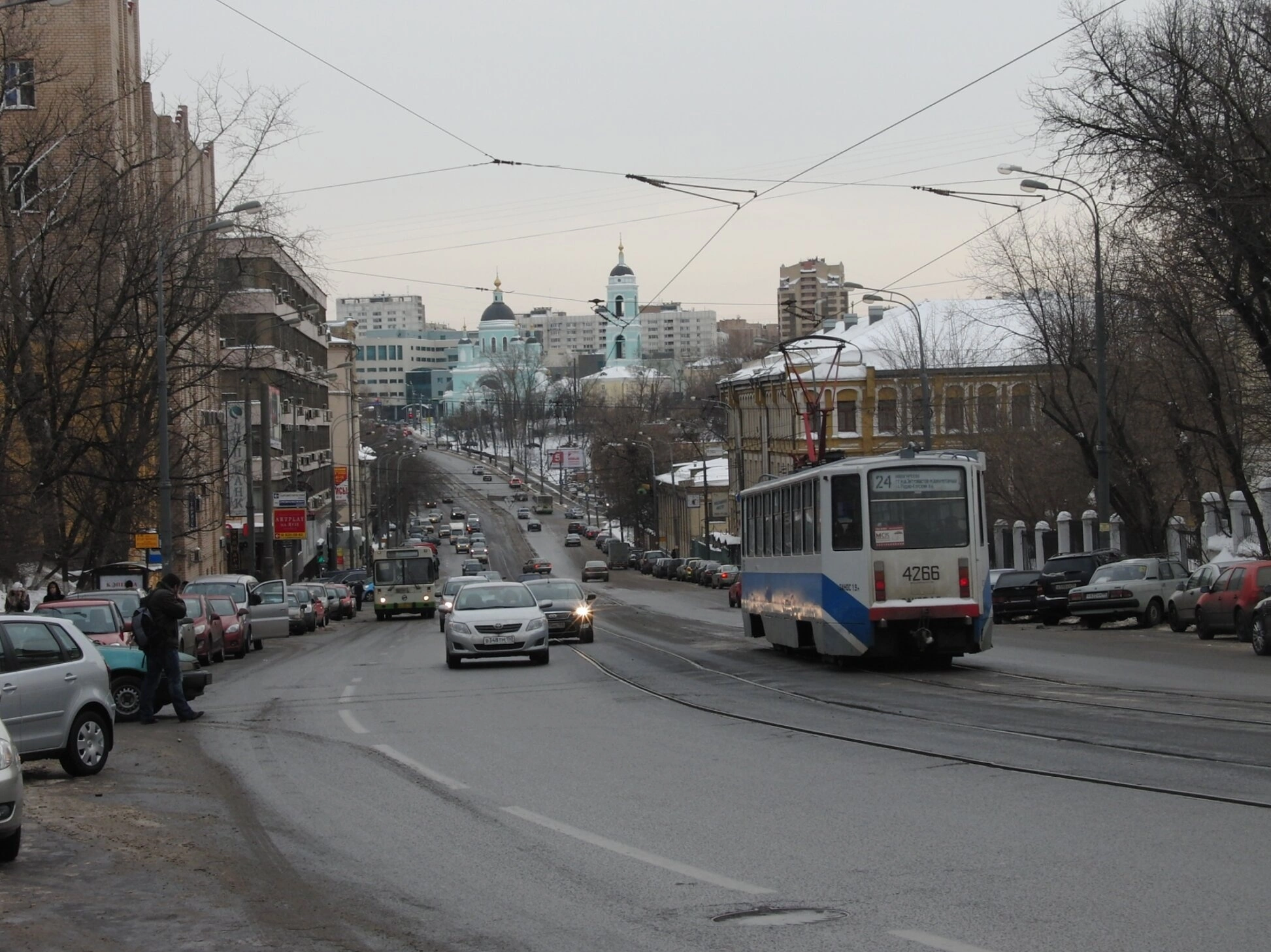Снимок сделан в холодное время года, о чем свидетельствует снежный покров, укрывающий землю и крыши зданий. Пасмурная погода создает особую атмосферу умиротворения, характерную для зимних дней в столице. На переднем плане изображена оживленная улица с движущимся транспортом, включая трамвай модели 4266, а также автомобили, припаркованные вдоль проезжей части.