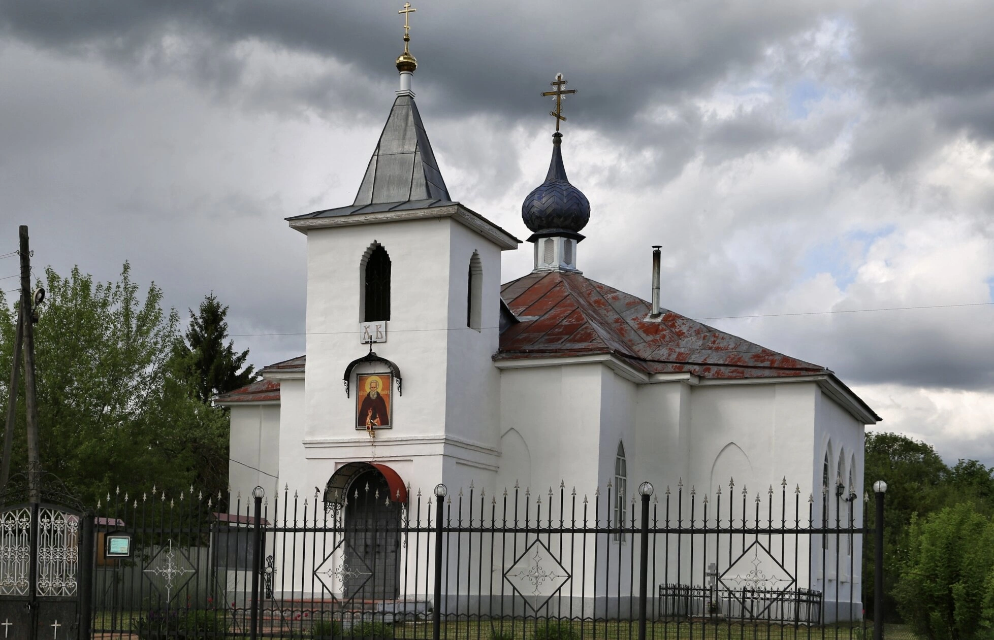 На заднем плане фотографии виднеются кроны деревьев и пасмурное небо, что придает изображению особую атмосферу спокойствия, умиротворения и светлой грусти, напоминая о вечных ценностях. Храм Преподобного Сергия Радонежского в Аньково продолжает оставаться важным духовным центром и прекрасным образцом православной архитектуры, сохраняя свою благодатную силу для молитвы и поклонения.