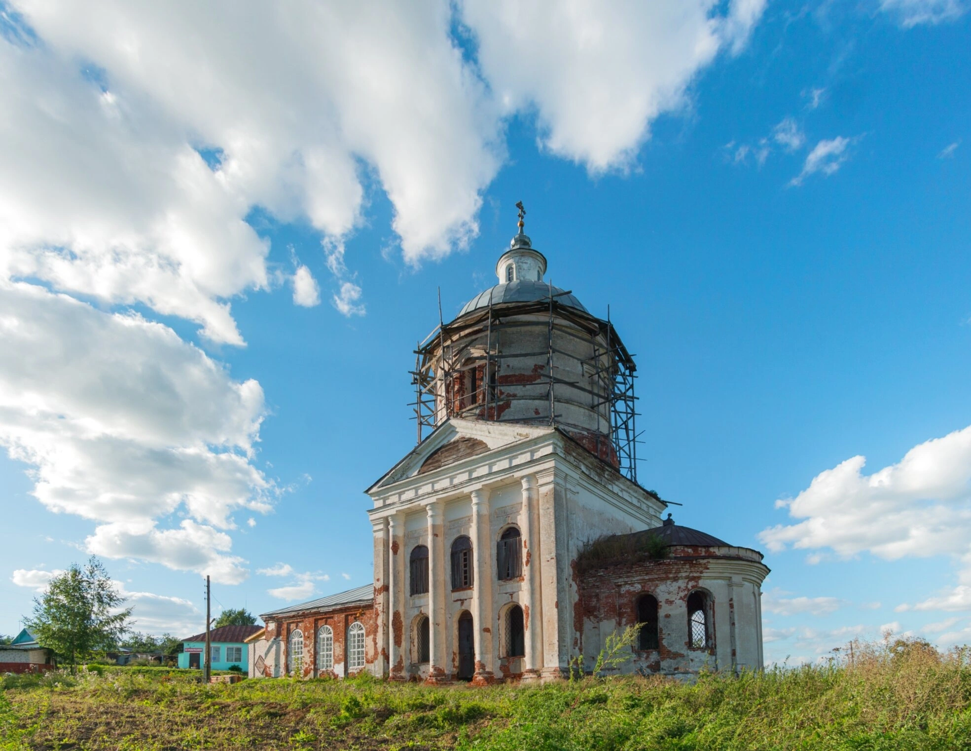 Окружение храма составляет живописная природная композиция: здание обрамлено зеленью деревьев, а на заднем плане виднеются сельские постройки и голубое небо с облаками. Несмотря на признаки ветхости кирпичных стен, храм сохраняет своё духовное величие и архитектурную выразительность. Данная фотография документально фиксирует важный этап в жизни святыни — процесс её возрождения и сохранения для будущих поколений.