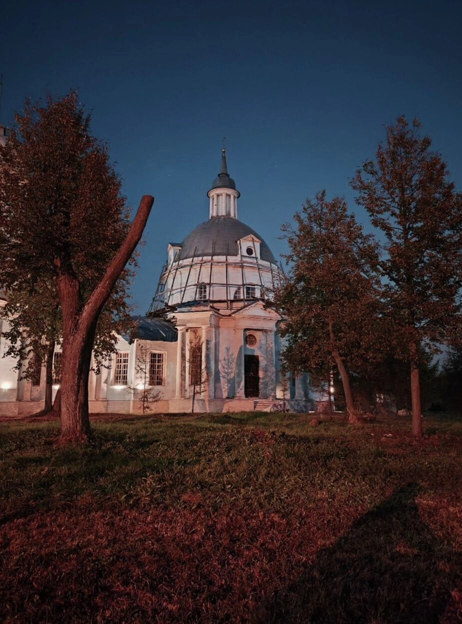 Вечернее освещение храма на фотографии символически отражает его исторический путь — от периода духовного мрака в годы запустения к свету возрождения и благодатной молитвенной жизни, которая не угасает в его стенах сегодня.
