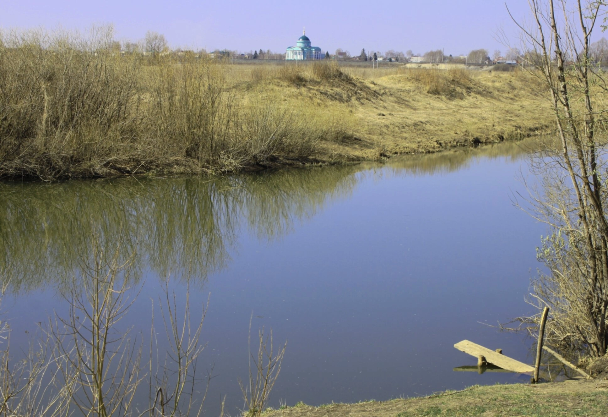 На переднем плане снимка виден спокойный водоём, чья зеркальная поверхность отражает небесную лазурь и усиливает ощущение благодатного покоя, исходящего от этого места. Берега обрамлены характерной для средней полосы России растительностью: луговой травой и кустарниками. Деревянные мостки, ведущие к воде, свидетельствуют о том, что это место является частью повседневной жизни местных жителей.