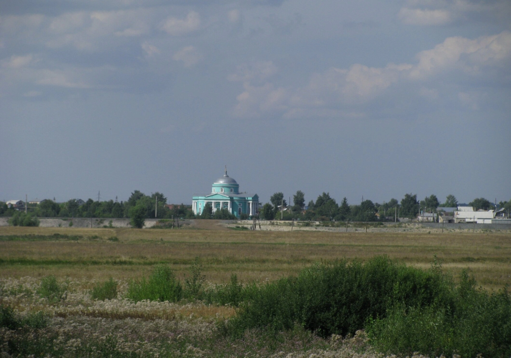 На фотографии запечатлён храм во имя Преподобного и Богоносного отца нашего Сергия, игумена Радонежского и всея России чудотворца, расположенный в селе Выездное Нижегородской области. Святыня живописно возвышается на фоне бескрайних полей и древесных крон, уходя в высокое облачное небо, что символизирует устремлённость человеческой души от земного к горнему.
