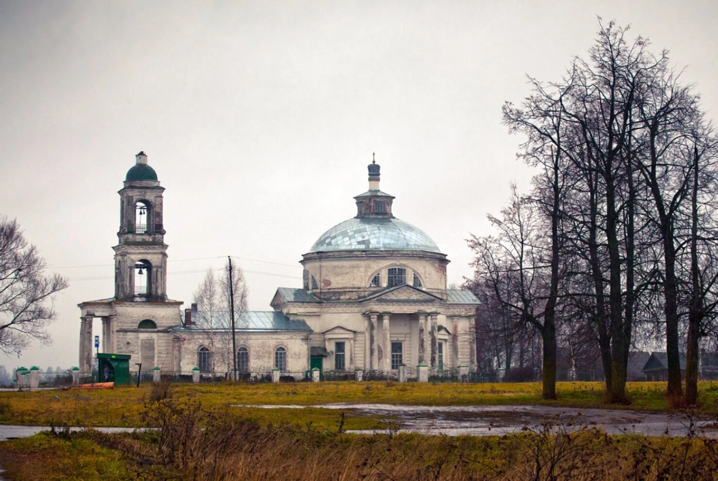 На фотографии запечатлена Церковь Преподобного Сергия Радонежского, расположенная в селе Татищев Погост Ростовского района Ярославской области. Этот действующий православный храм является выдающимся памятником архитектуры эпохи классицизма и объектом культурного наследия регионального значения.
