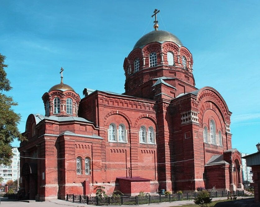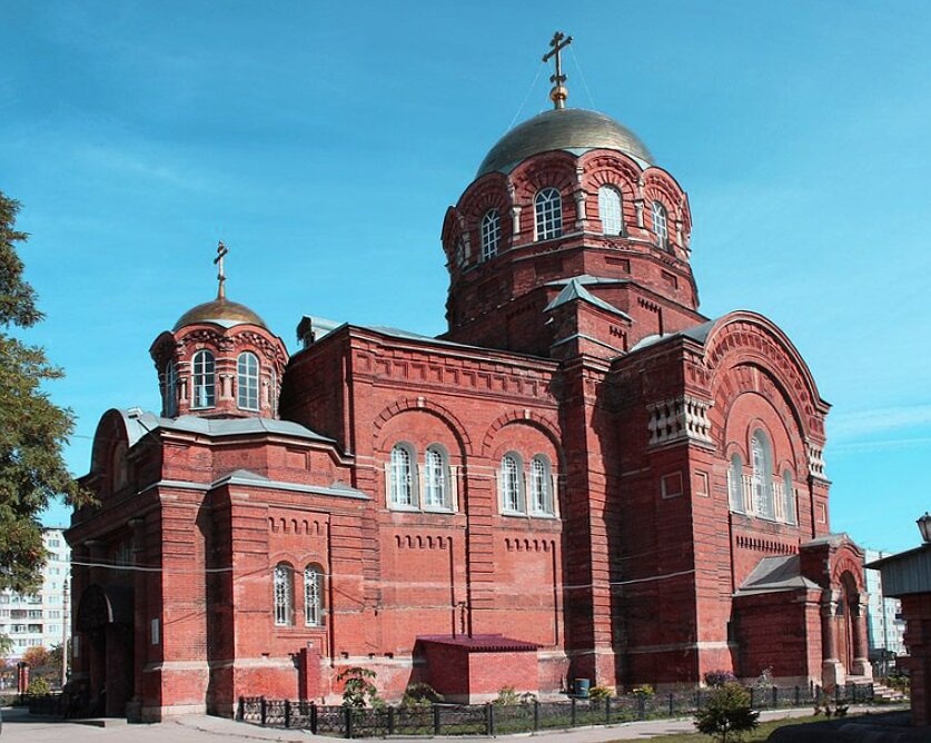 На представленной фотографии запечатлён храм во имя Преподобного и Богоносного отца нашего Сергия, игумена Радонежского и всея России чудотворца, расположенный в городе Туле. Этот православный храм, возведённый из красного кирпича, является ярким образцом русского церковного зодчества конца XIX — начала XX века.