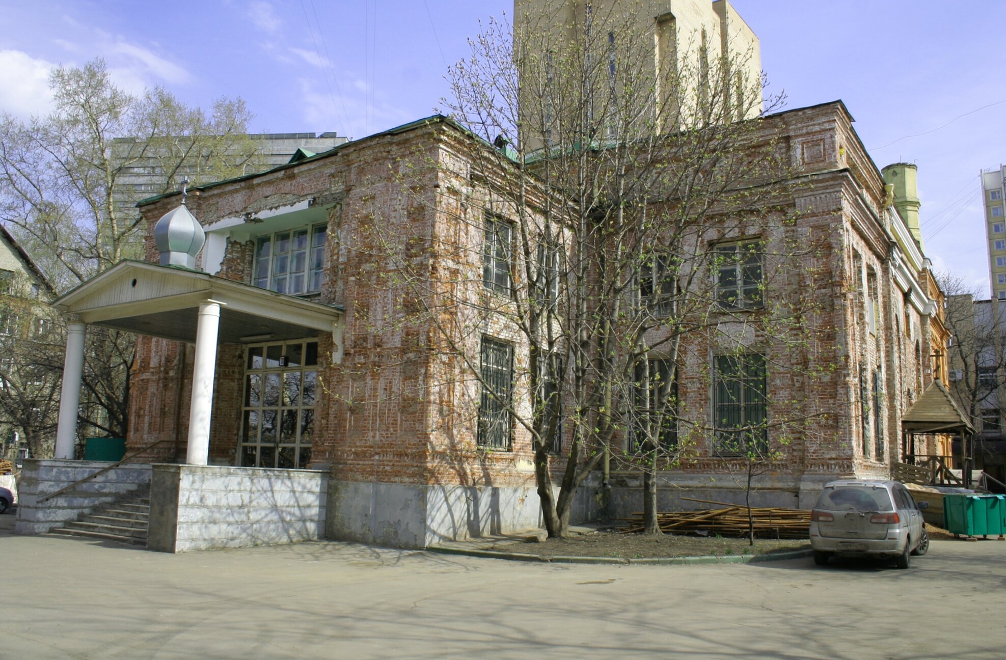 Святыня расположена в историческом районе Москвы, на улице Международной. Храм был возведён в начале XX века по проекту архитектора Николая Струкова в неорусском стиле, став одним из последних крупных церковных сооружений, построенных в столице до революции 1917 года. На снимке хорошо читается монументальный кирпичный объём здания, увенчанный мощным световым барабаном с шлемовидным куполом. Фасад украшают декоративные кокошники, аркатурные пояса и изразцовые вставки, характерные для национального направления в зодчестве.