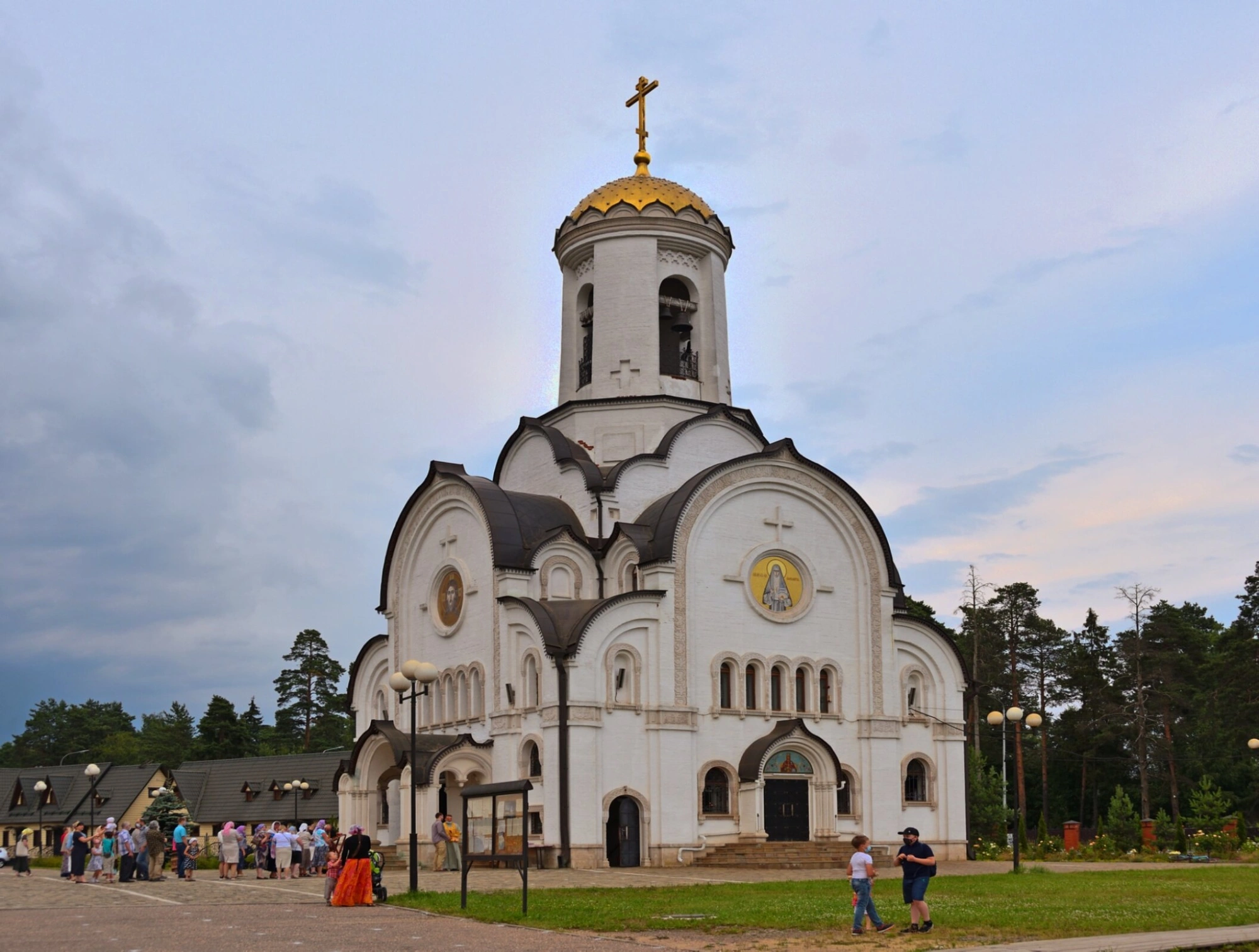 Территория вокруг храма благоустроена и ухожена: зелёные насаждения и каменная ограда создают гармоничный образ святого места. Прихожане, изображённые на переднем плане, свидетельствуют о том, что храм является действующим и живёт полноценной духовной жизнью, принимая под свои своры всех seeking утешения и молитвы.