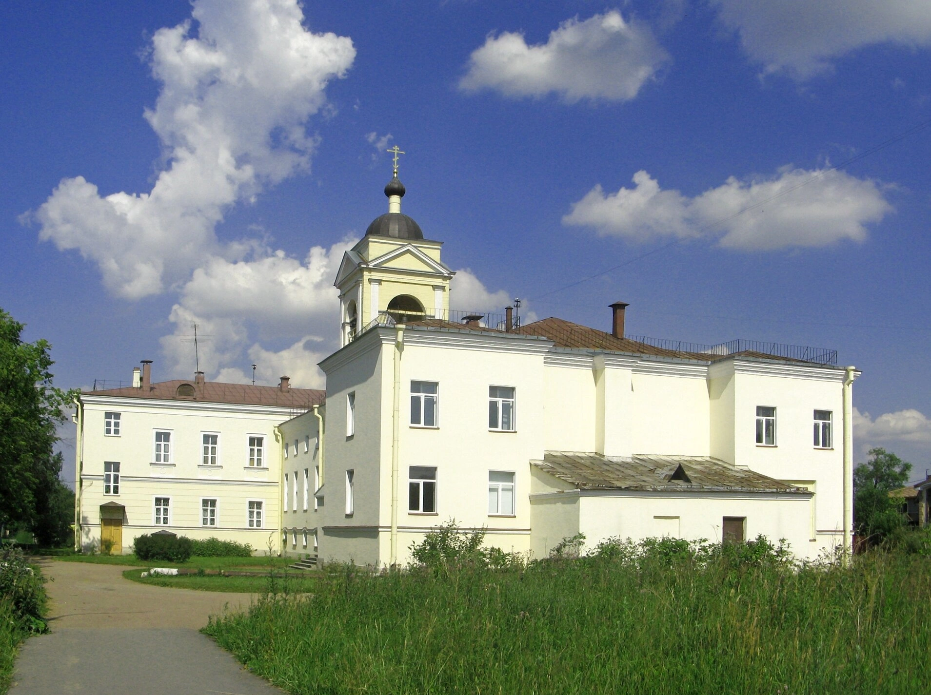 На переднем плане фотографии видна грунтовая дорожка, ведущая к храму через поле с высокой травой. На заднем плане просматриваются другие строения церковного комплекса, также выполненные в едином стиле с коричневыми крышами. Ясное голубое небо с белоснежными облаками и окружающая зелень деревьев дополняют благостный образ этого святого места.
