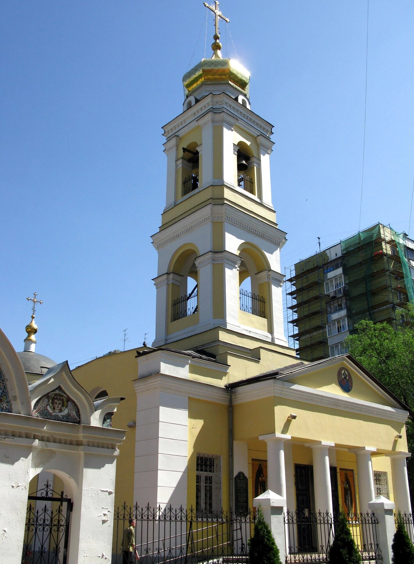 Здание храма окрашено в теплый желтый цвет, который гармонично сочетается с белыми декоративными элементами и обрамлениями окон. Главный купол, увенчанный золоченым покрытием и православным крестом, возвышается над основным объемом храма, символизируя духовное устремление ввысь. Особое внимание привлекает высокая трехъярусная колокольня, расположенная в центральной части комплекса. Каждый ярус колокольни украшен арочными проемами, в которых размещены церковные колокола, призывающие верующих на богослужение.