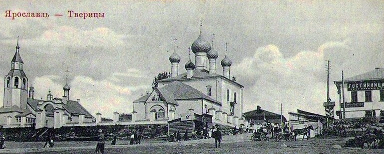 На представленной старинной фотографии запечатлён исторический облик храма в честь преподобных Зосимы и Савватия, соловецких чудотворцев, расположенного в живописном районе Тверицы в Ярославле. Этот пятиглавый каменный храм с высокой колокольней был возведён в 1742 году на месте обветшавшей деревянной церкви и являлся духовным центром всего Тверицкого посёлка.