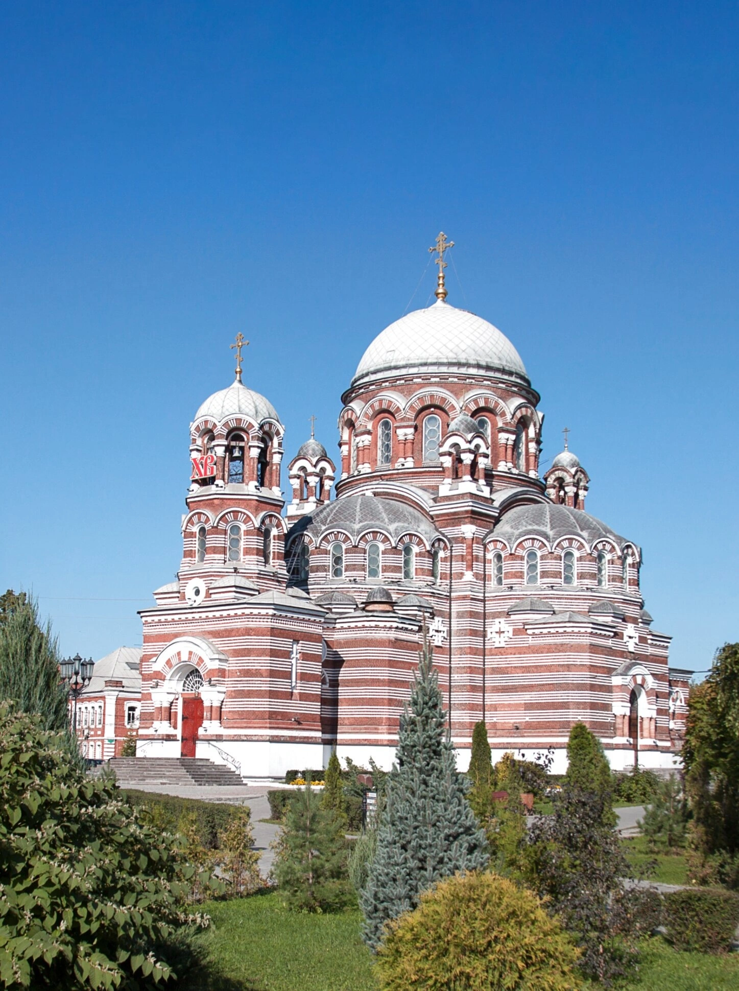 Архитектурный облик храма поражает своей монументальностью и благолепием. Центральный объём здания увенчан массивным световым барабаном, над которым возвышается золочёная главка с водружённым православным крестом. Симметричную композицию дополняют боковые главы, что создаёт гармоничный и завершённый силуэт, устремлённый в небеса. Фасады обильно украшены кирпичным декором — аркатурными поясами, кокошниками, ширинками и наличниками, которые контрастируют с краснокирпичной кладкой благодаря побелке.
