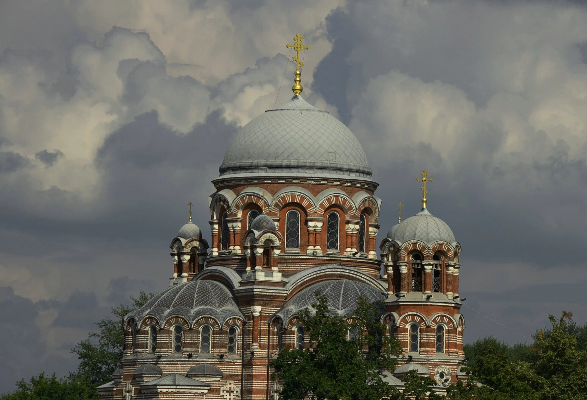 В нижней части кадра видна зелёная листва деревьев, окружающих храм, что указывает на ухоженность территории и гармонию творения рук человеческих с Божьим миром. Пасмурное небо с объёмными облаками на заднем плане подчёркивает монументальность и духовную силу архитектурного сооружения.