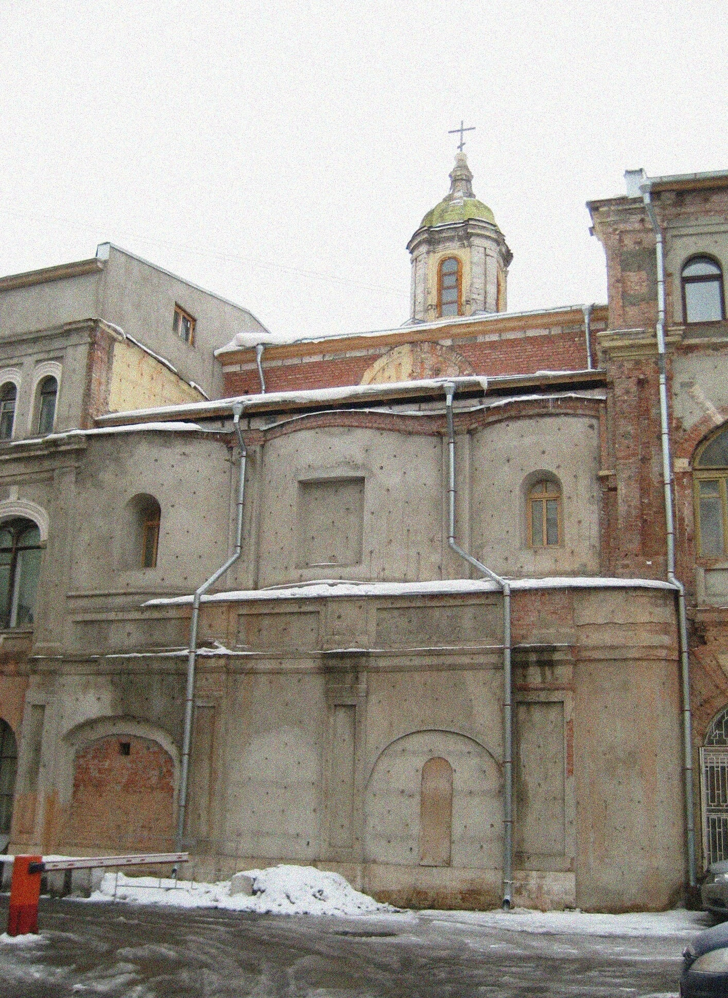Архитектурный облик храма, представленный на снимке, формировался на протяжении нескольких столетий. Основной объём церкви выполнен в стиле русского узорочья, характерного для XVII века, и увенчан традиционным пятиглавием, символизирующим Господа Иисуса Христа и четырёх евангелистов. Фасад украшен богатым кирпичным декором, кокошниками и нарядными наличниками, что придаёт зданию торжественный и праздничный вид.
