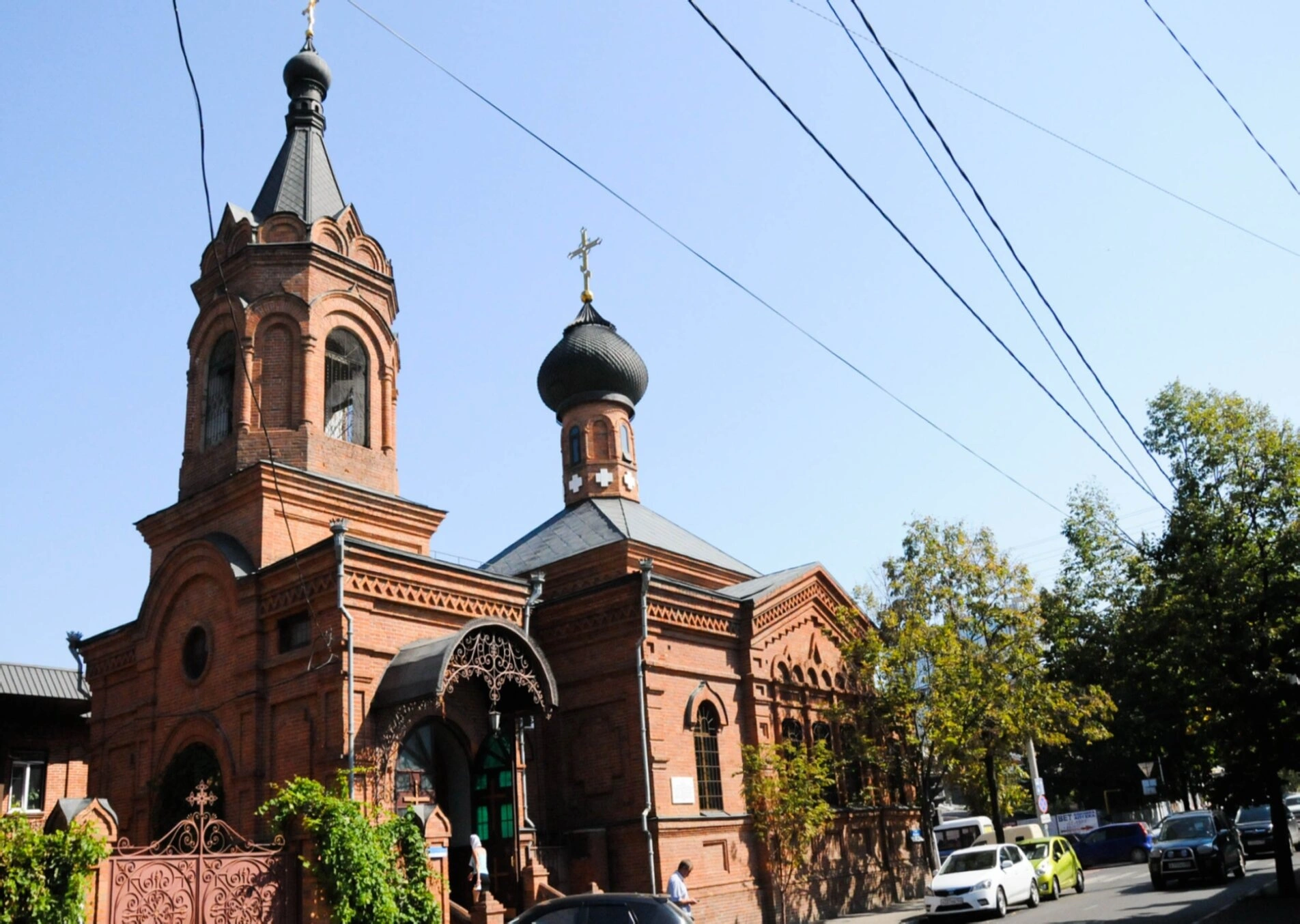 Перед храмом проходит оживлённая городская улица, что подчёркивает неразрывную связь духовной жизни с повседневным городским ритмом. Деревья, обрамляющие дорогу, добавляют кадру естественности и гармонии. Исторически храм был возведён в 1892 году на средства купца Игната Волчака и городских жителей. После decades забвения и разорения в советский период святыня была возвращена Русской Православной Церкви и полностью восстановлена, вновь став местом молитвы и духовного притяжения для верующих. Ныне при храме действует воскресная школа и библиотека, совершаются регулярные богослужения.