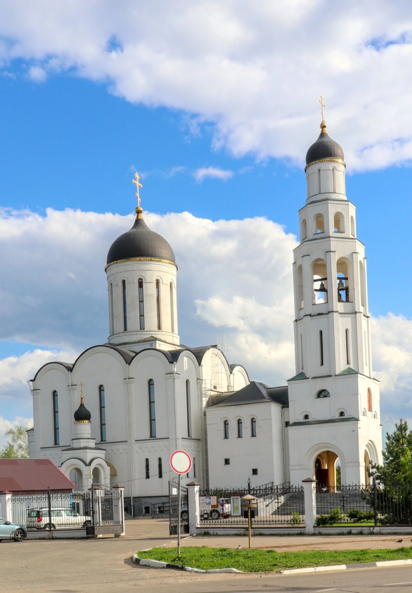 Перед входом на огороженную территорию храма видны Святые врата и установленный дорожный знак. Окружающий пейзаж с зелёными насаждениями и припаркованным транспортом свидетельствует о том, что святой храм находится в городской черте, оставаясь духовной обителью для православных христиан. Данная церковь является центром религиозной жизни города Апрелевки, где верующие обретают молитвенное утешение и участвуют в святых таинствах.