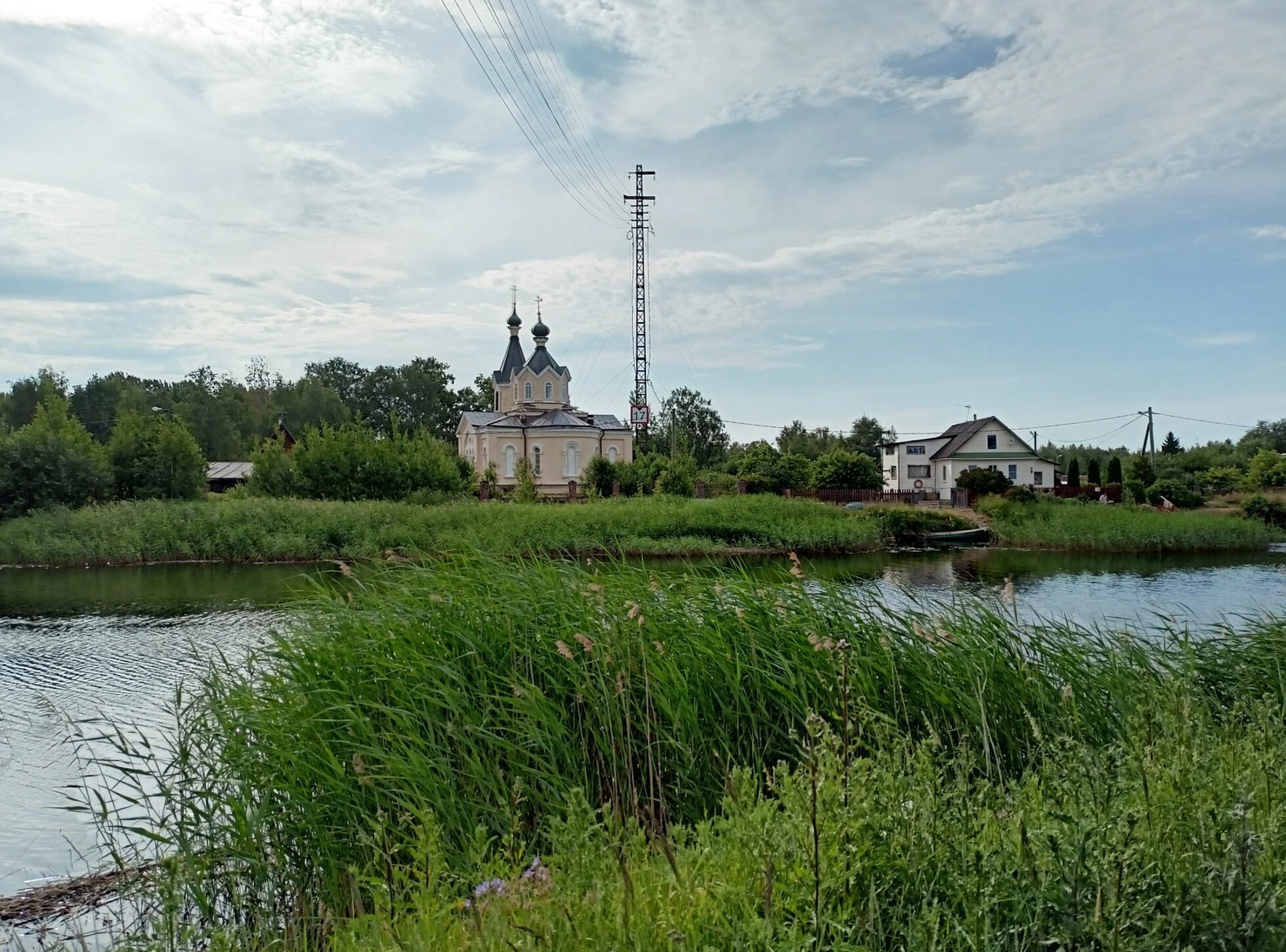 На фотографии запечатлён православный храм в честь святого пророка Божия Илии, расположенный в деревне Чёрное Всеволожского района Ленинградской области. Святыня стоит на живописном берегу водоёма, создавая гармоничное единство архитектурного творения и северной природы. Высокая зелёная трава и тростник обрамляют береговую линию, а деревья и кустарники образуют естественный зелёный фон, подчёркивая уединённость и духовную сосредоточенность этого места.