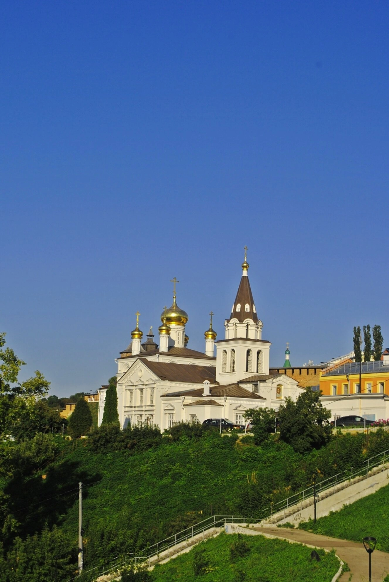 Святыня окружена обильной зеленью деревьев и кустарников, что создаёт ощущение уединённости и покоя. К вратам храма ведёт пешеходная дорожка с перилами, словно приглашая верующих и паломников на молитву. На заднем плане виднеются здания городской застройки, напоминая о гармоничном соседстве духовного центра с мирской жизнью. Ясное голубое небо над главой храма завершает этот светлый и умиротворяющий образ, запечатлённый в яркий летний день.
