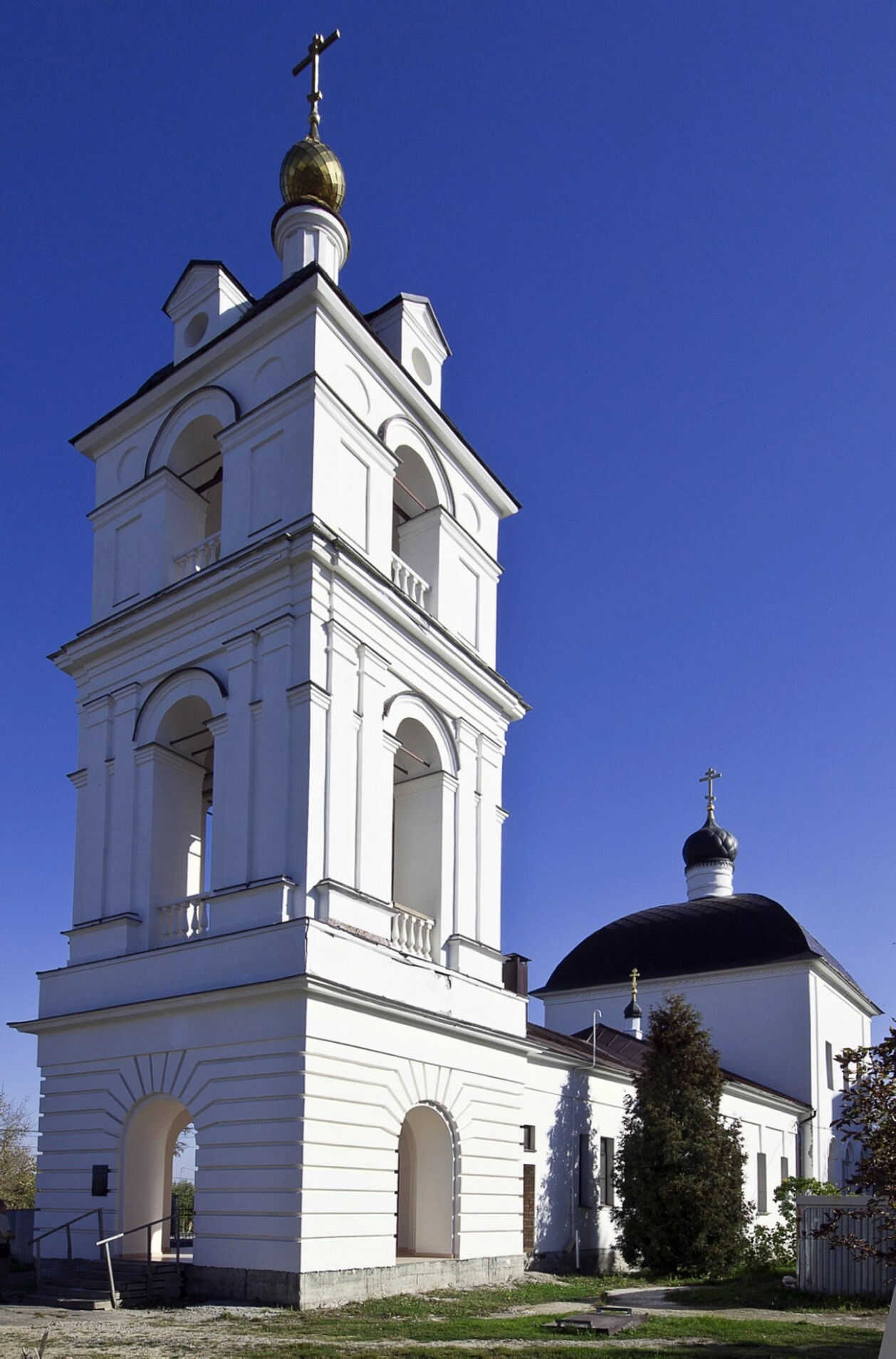 Архитектурный облик храма гармонично сочетает монументальность и изящество. Доминантой комплекса является высокая многоярусная колокольня, устремлённая в небо. Её арочные проёмы, украшенные балюстрадами, завершаются золочёной главкой с водружённым на неё крестом, сияющим в лучах солнца. Основной объём церкви венчает тёмный купол, на котором также установлен православный крест, символизирующий искупительную жертву Христа.