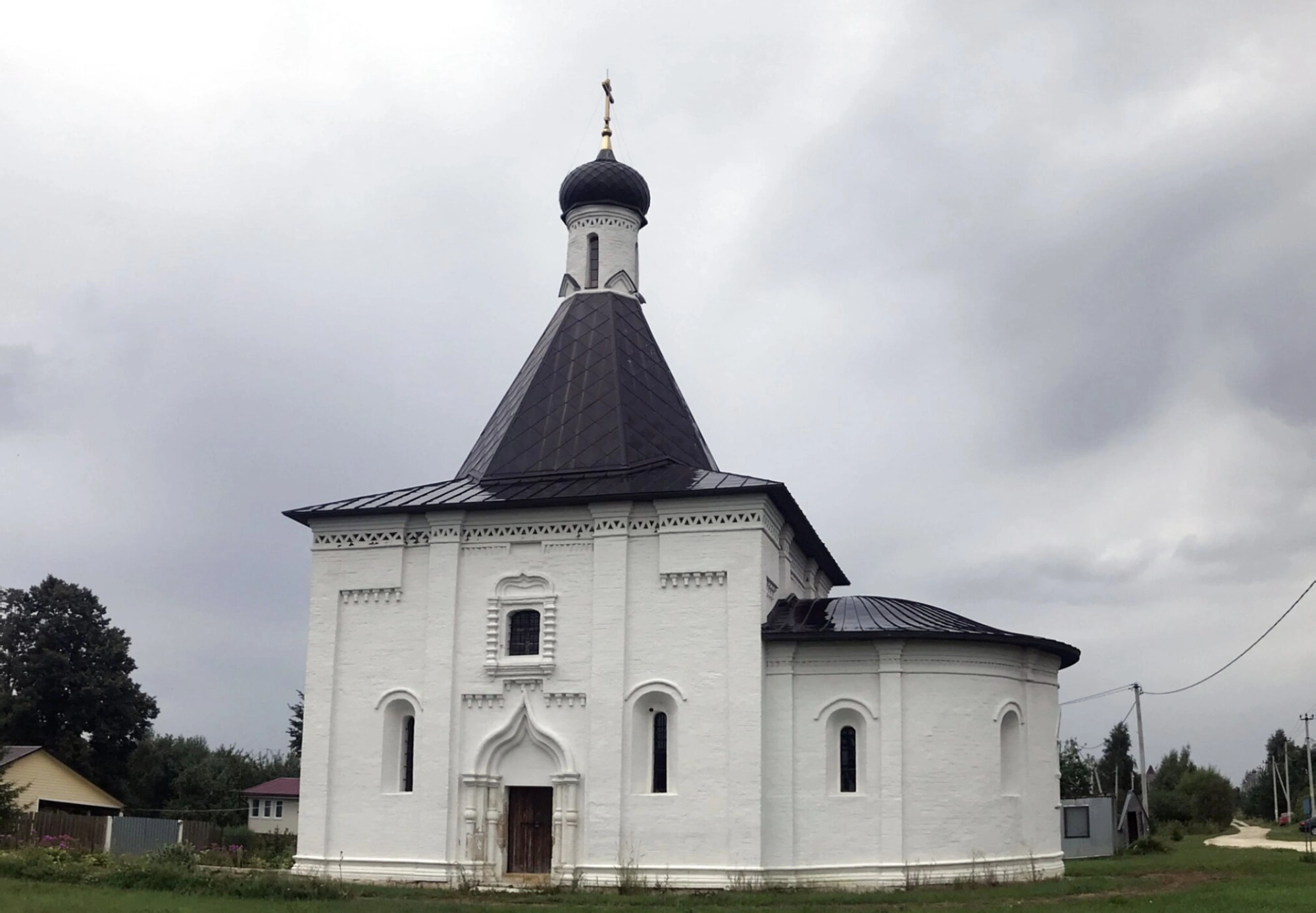 На представленной фотографии запечатлена старинная каменная церковь во имя святого славного пророка Божия Илии, расположенная в селе Пруссы Коломенского городского округа Московской области. Этот православный храм является одним из ценных памятников русской архитектуры второй половины XVI столетия.