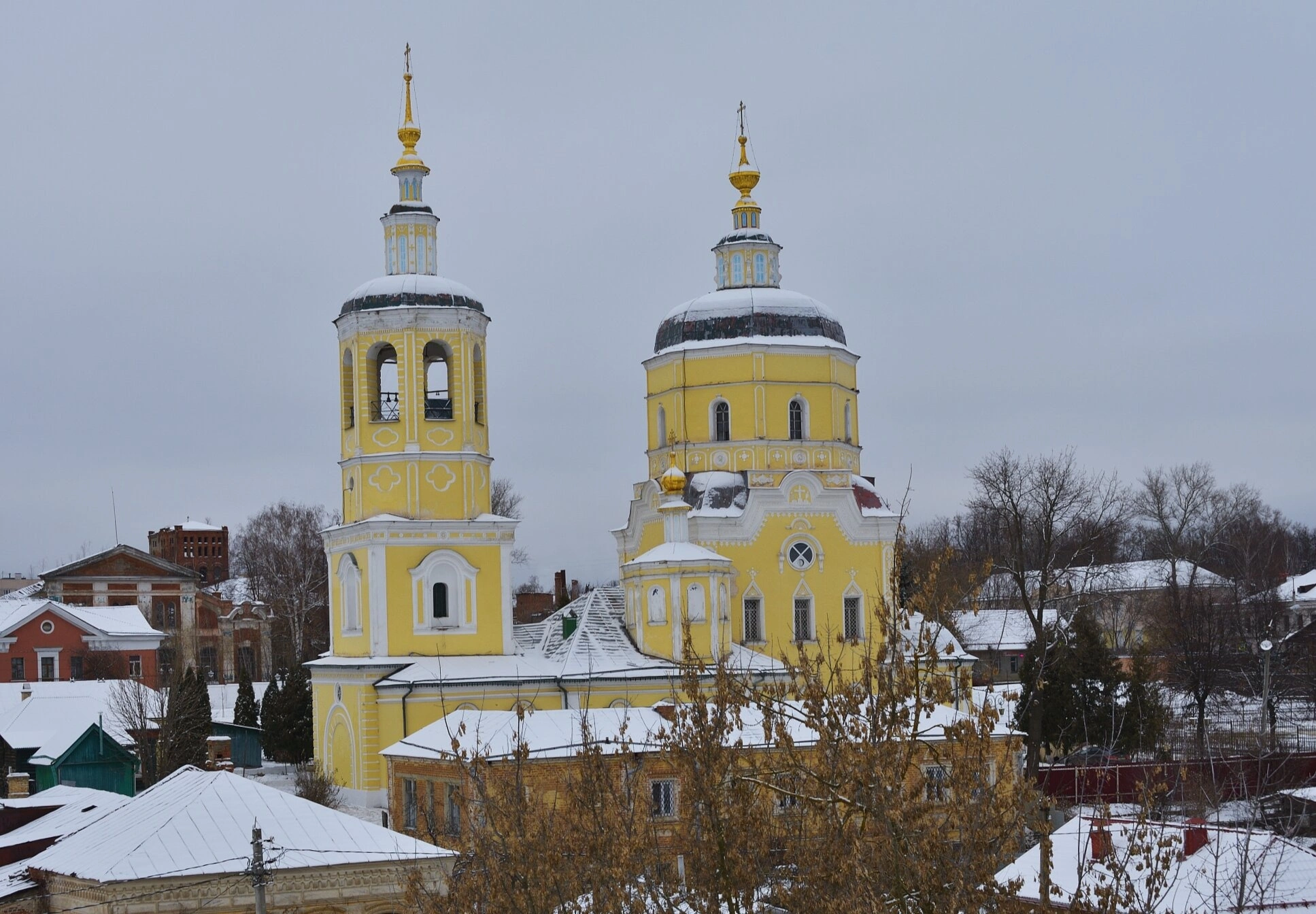 Белокаменный храм с золотыми куполами, увенчанными крестами, сияющими в лучах солнца, представляет собой прекрасный образец русского церковного зодчества. Две стройные колокольни по сторонам от основного объёма придают сооружению особую торжественность и симметрию. Жёлтые стены храма контрастируют с белоснежными декоративными элементами и зелёными кровлями, создавая яркий и запоминающийся образ.