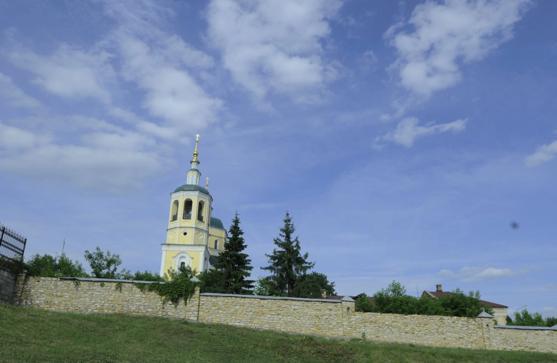 Белокаменные стены храма и изумрудные купола, увенчанные златоглавыми крестами, сияют под покровом чистого неба с легкими облаками. На переднем плане видна невысокая каменная ограда, символически отделяющая мирскую суету от места молитвенного уединения и благодати. За ней простирается ухоженный зелёный газон, подчеркивающий умиротворенность и благоустроенность святого места.