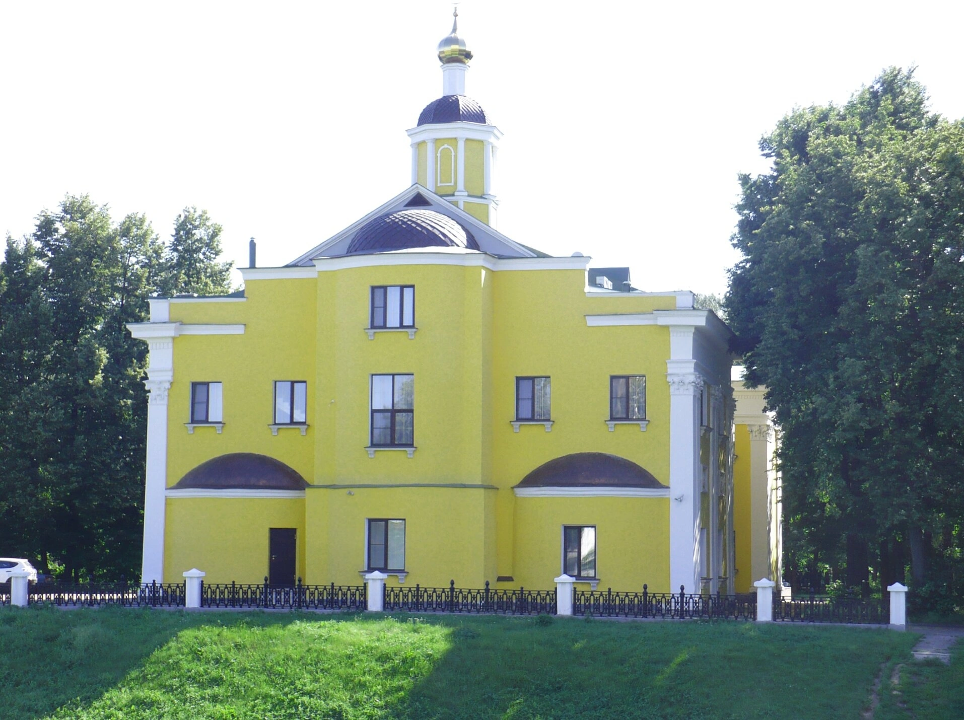 Здание церкви, выкрашенное в тёплый жёлтый цвет, увенчано массивным куполом, который завершается золочёным шпилем и сияющим крестом, устремлённым в небеса. Вокруг храма разбита ухоженная территория, обрамлённая зелёными насаждениями и оградой, что создаёт атмосферу благолепия и умиротворения.