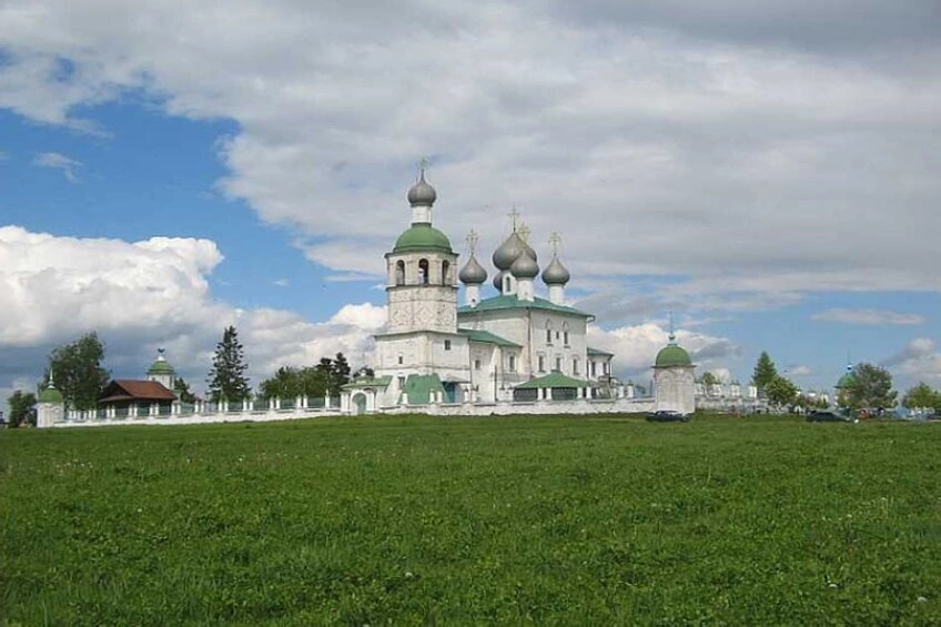 Фотография позволяет рассмотреть монументальность и благолепие этого духовного центра, который продолжает служить оплотом православной веры на Вологодчине, напоминая о благочестии и жертвенности наших предков, созидавших такие храмы во славу Божию.