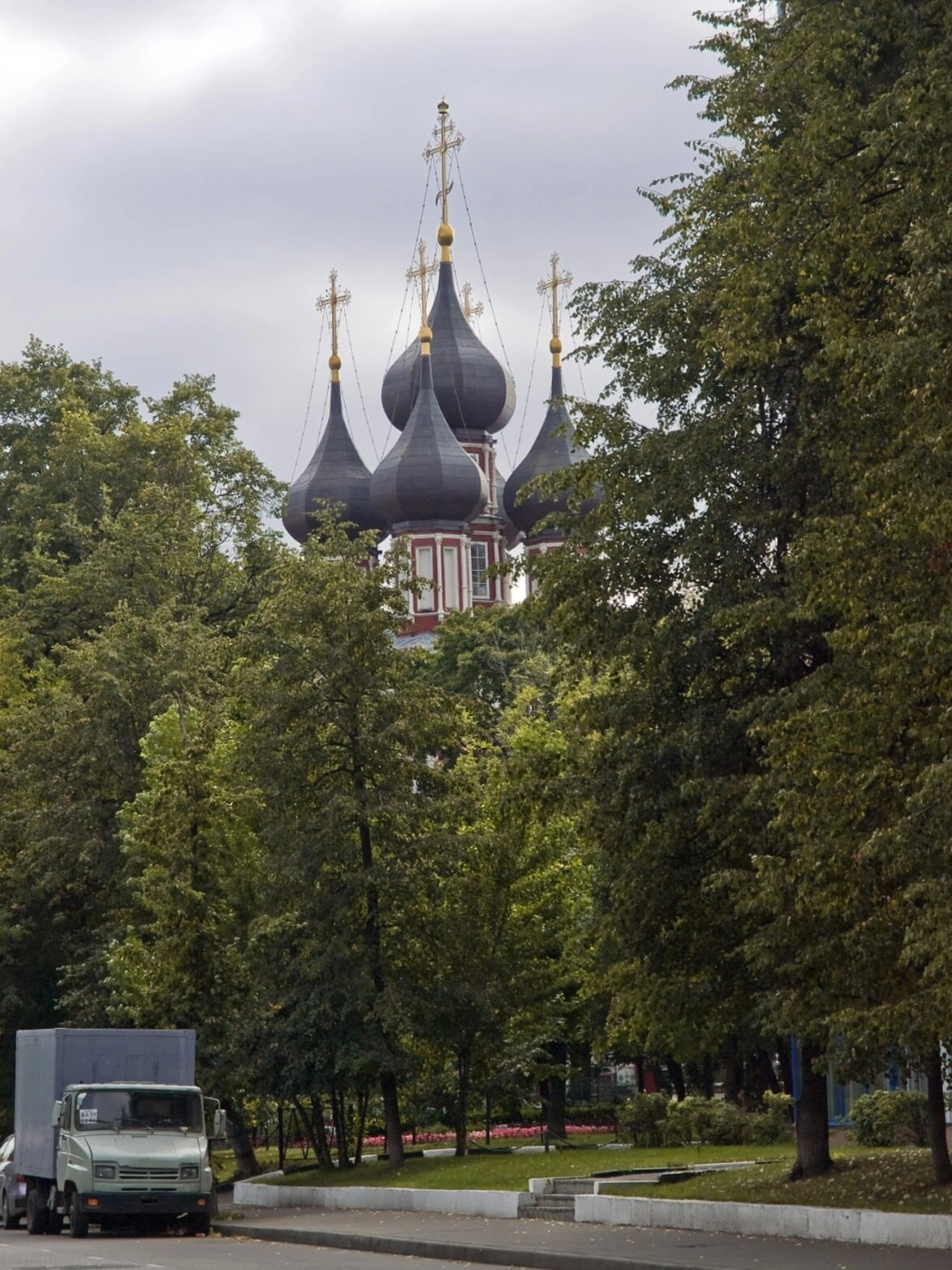 На представленной фотографии запечатлён величественный православный храм — Церковь Ризоположения Пресвятой Богородицы, что на Донской улице в Москве. Этот священный памятник архитектуры, освящённый в честь одного из великих Богородичных праздников, является неотъемлемой частью историко-архитектурного ансамбля Московской епархии.