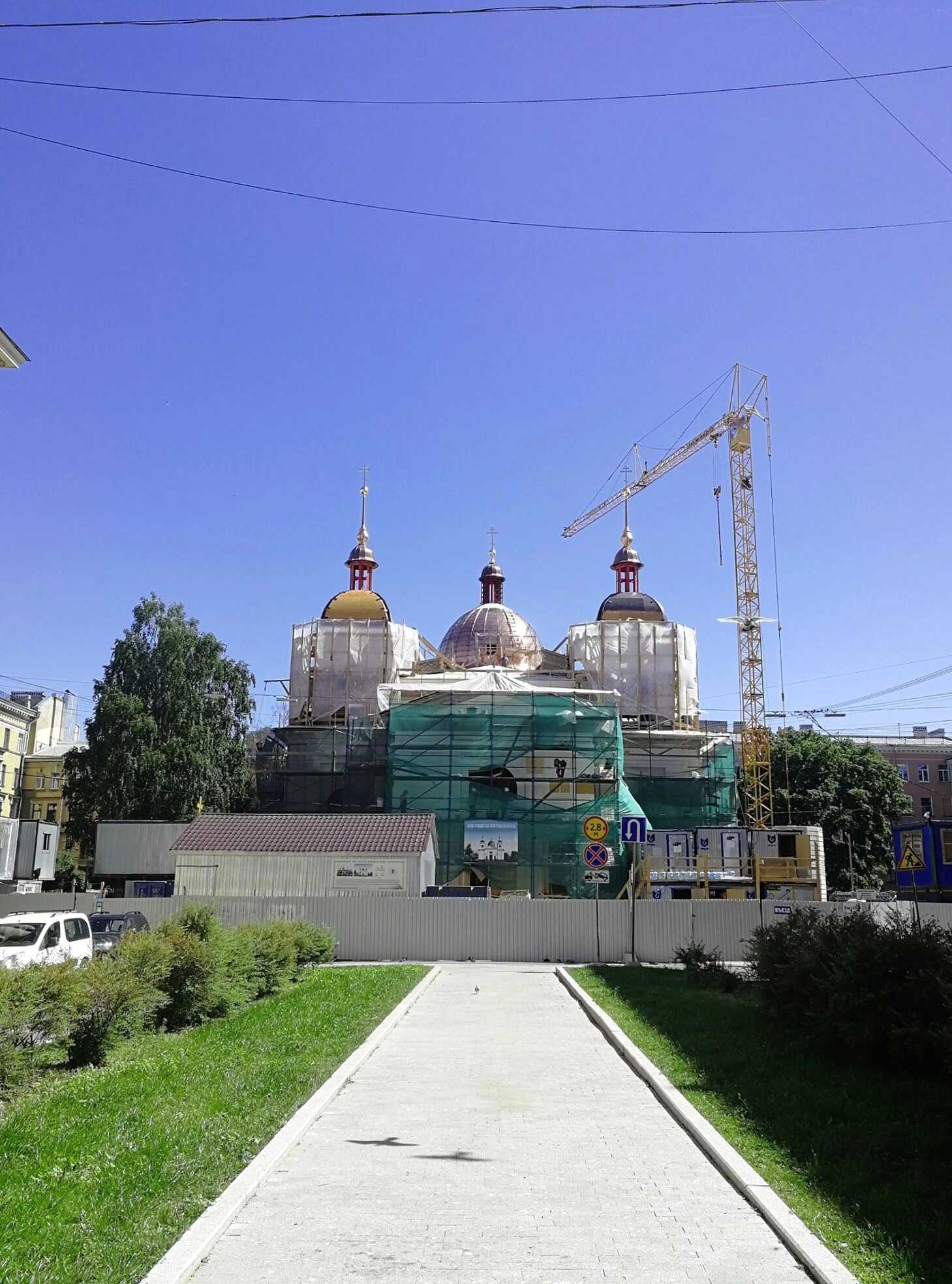 На представленной фотографии запечатлён воссозданный храм Рождества Христова на Песках, являющийся духовной и архитектурной доминантой исторического района Санкт-Петербурга. Снимок сделан в период завершающего этапа работ, о чём свидетельствуют строительные леса и кран, окружающие святыню. Несмотря на это, величественный облик церкви, увенчанной тремя золочёными куполами с крестами, явственно проступает сквозь временные конструкции, символизируя возрождение из небытия.