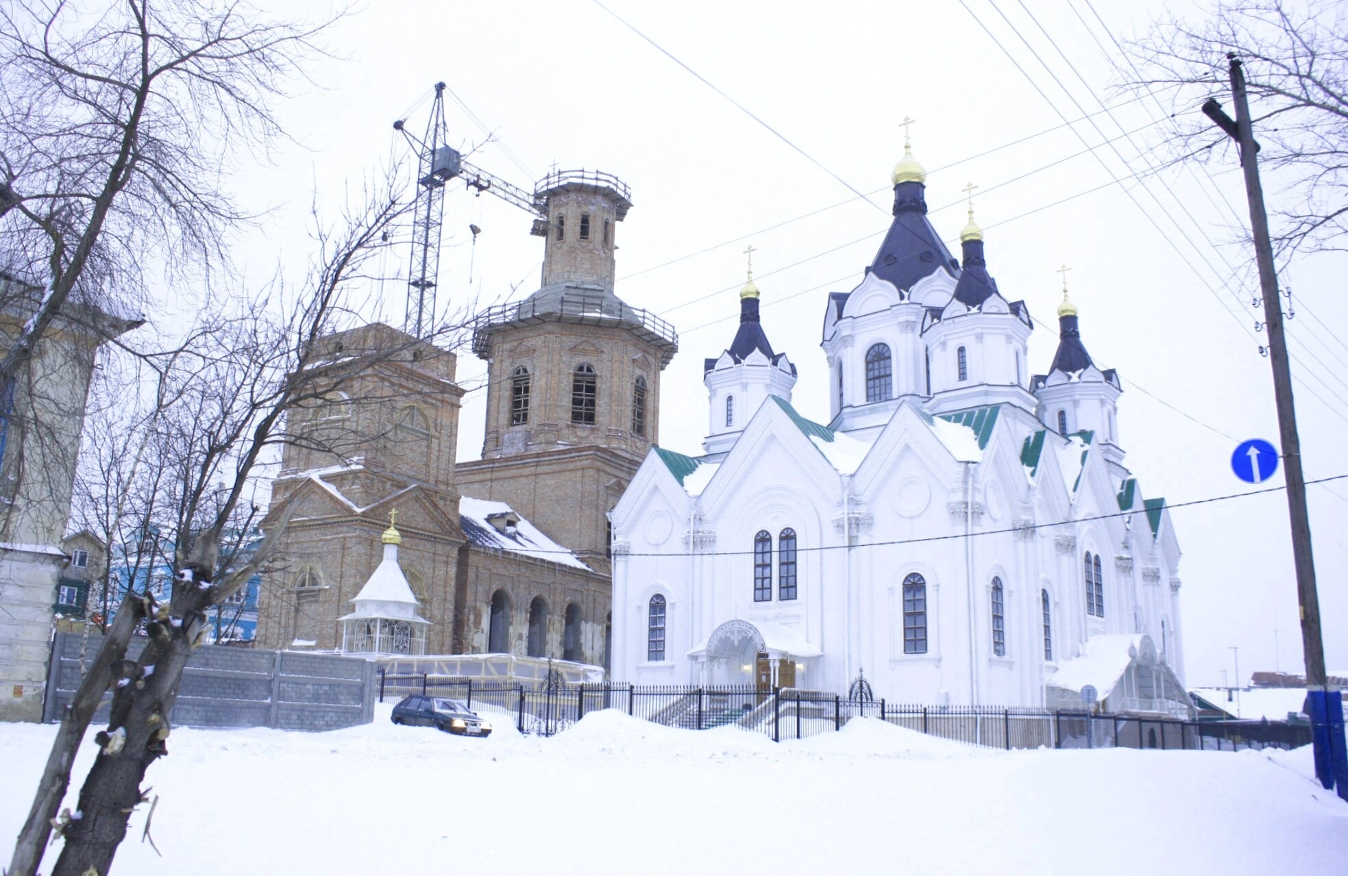 Глубокий снежный покров, укрывающий землю, и безлиственные деревья создают атмосферу благоговейной тишины и спокойствия, характерную для зимних месяцев. На переднем плане фотографии припаркован автомобиль, а на заднем — виднеются элементы городской инфраструктуры, что гармонично соединяет священное и мирское, подчёркивая неразрывную связь храма с жизнью прихожан.