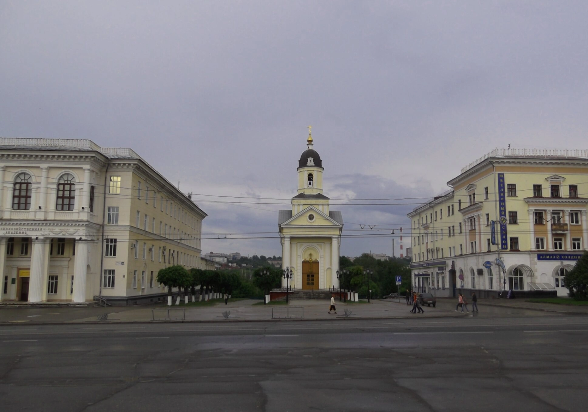 Белоснежные стены храма и золочёные купола, сияющие под небом, создают возвышенный образ, наполняющий сердца верующих благоговением. Церковь гармонично вписана в городской ландшафт центральной улицы Карла Маркса, где старина и современность существуют в неразрывном единстве. На снимке также видны окружающие здания, формирующие исторический облик этой части Чебоксар.