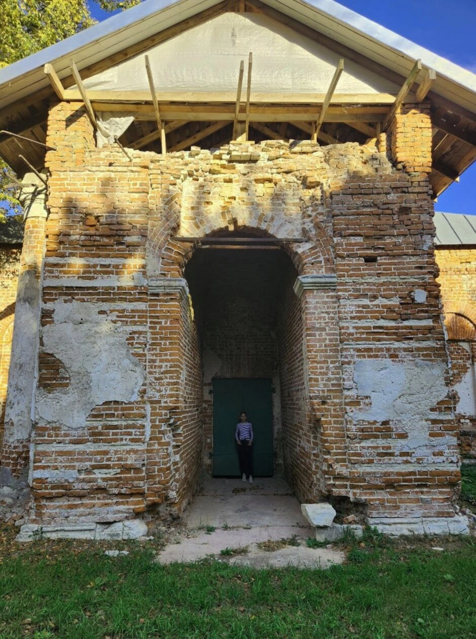 На представленной фотографии запечатлен вход в Храм Рождества Христова, расположенный в деревне Гололобово Коломенского района Московской области. Святыня представляет собой кирпичное здание, находящееся в благодатном процессе восстановления и реставрации.