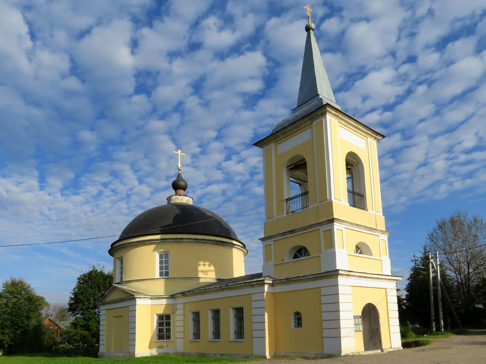 На фасадах здания читаются изящные оконные проёмы арочной формы, характерные для классицизма. Колокольня имеет открытые арочные проёмы для колоколов, ограждённые балюстрадой. Храм стоит на открытом пространстве, под сенью бездонного голубого неба с плывущими облаками, что придаёт всему ансамблю возвышенное и величественное звучание. Окружающий пейзаж с зелёными травяными покровами и древесными насаждениями подчёркивает умиротворённость и духовную значимость этого места.