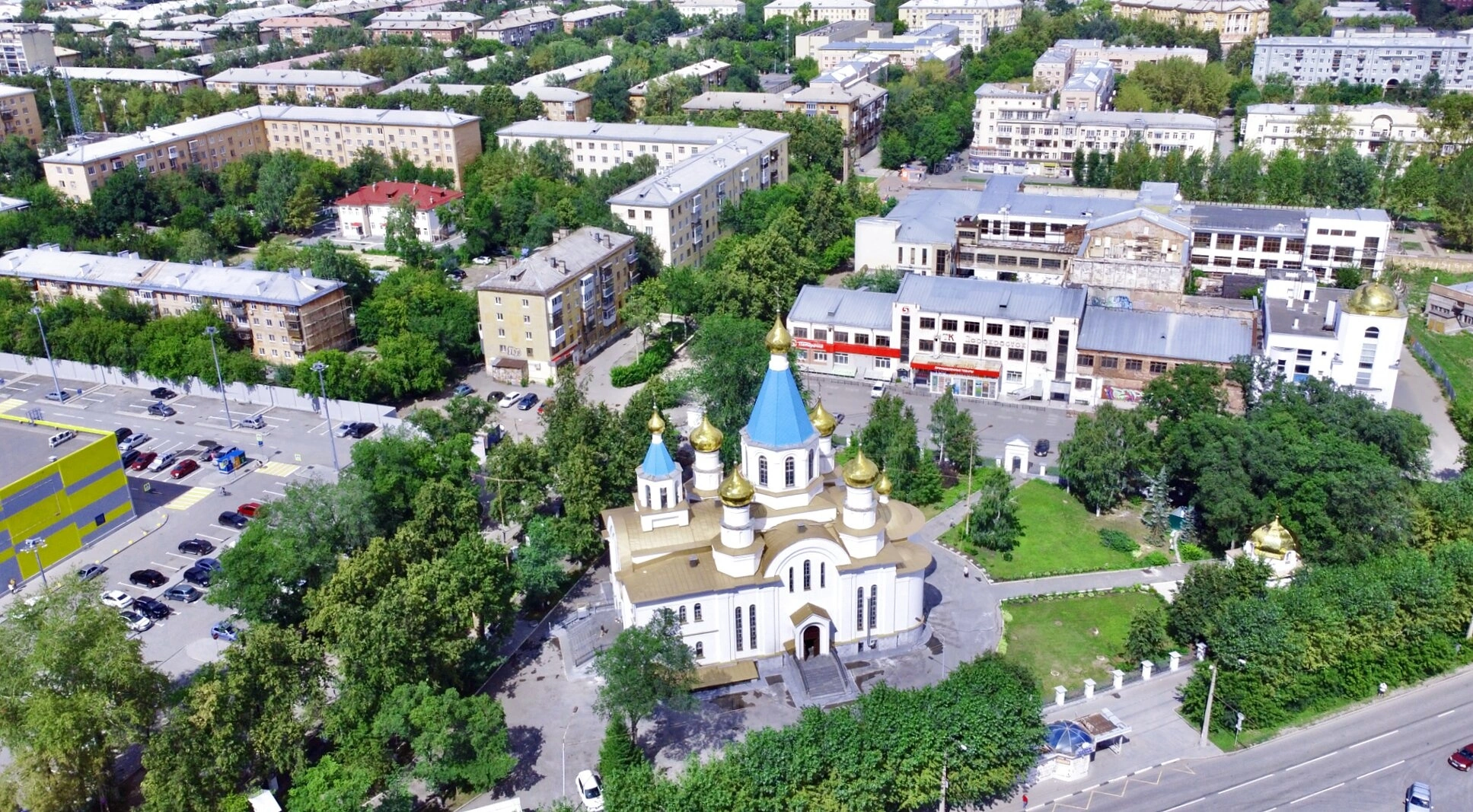 На переднем плане фотографии видны ухоженные зелёные насаждения, подчёркивающие умиротворённую атмосферу вокруг дома Божьего. Городская инфраструктура, включающая дороги и многоэтажные здания, органично соседствует с церковью, свидетельствуя о неразрывной связи духовной жизни и повседневности. Фотография передаёт не только внешнюю красоту храма, но и его значение как места молитвы, соборной встречи человека с Богом посреди современного мира.
