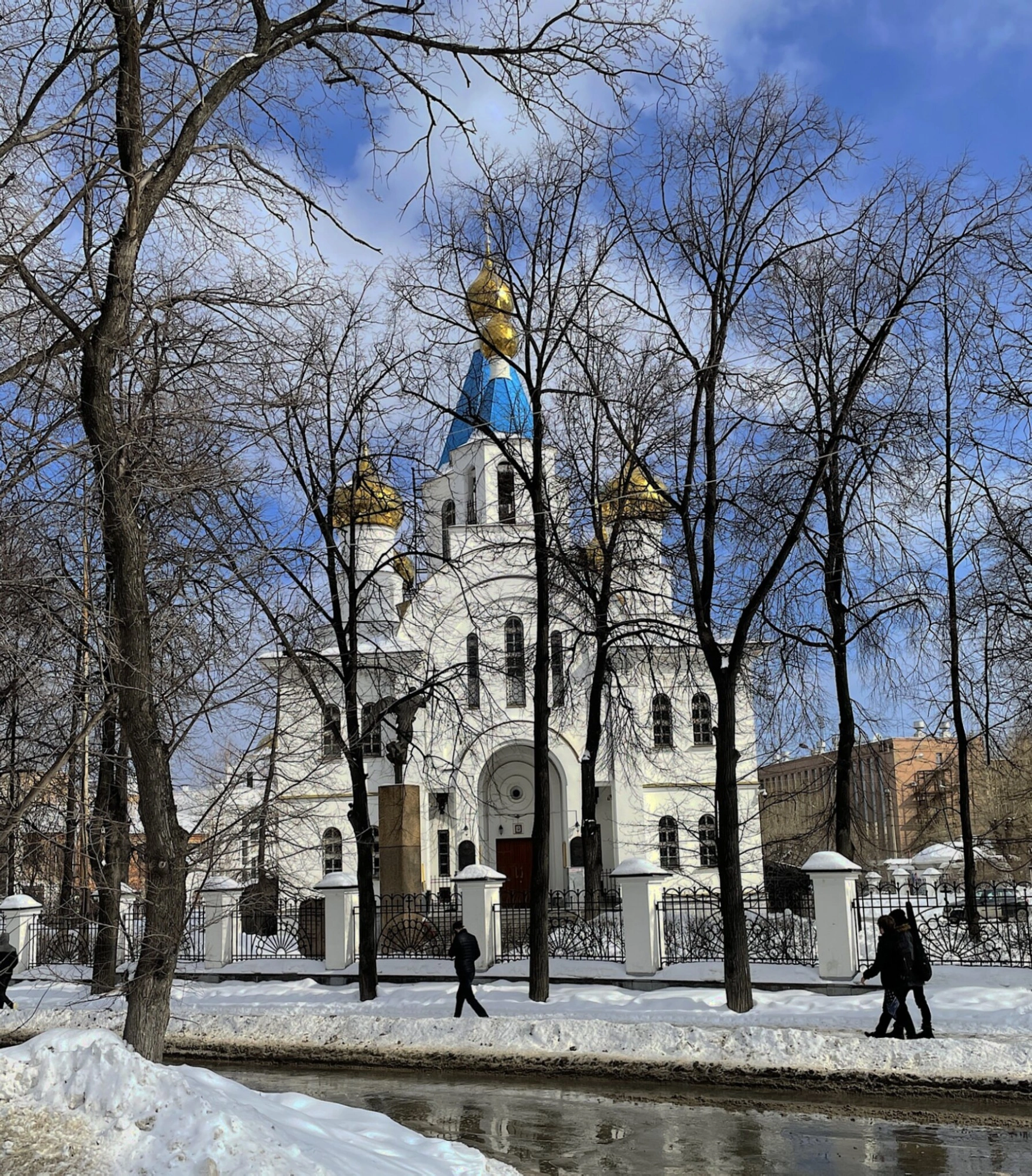 Храм окружают оголённые ветви деревьев, сквозь которые проникает мягкий свет, создавая атмосферу тихого благоговения и спокойствия, свойственную православным святыням. На переднем плане видны следы на снегу, а вдоль расчищенной дорожки движутся прихожане, что добавляет снимку жизненную динамику и человеческое измерение.