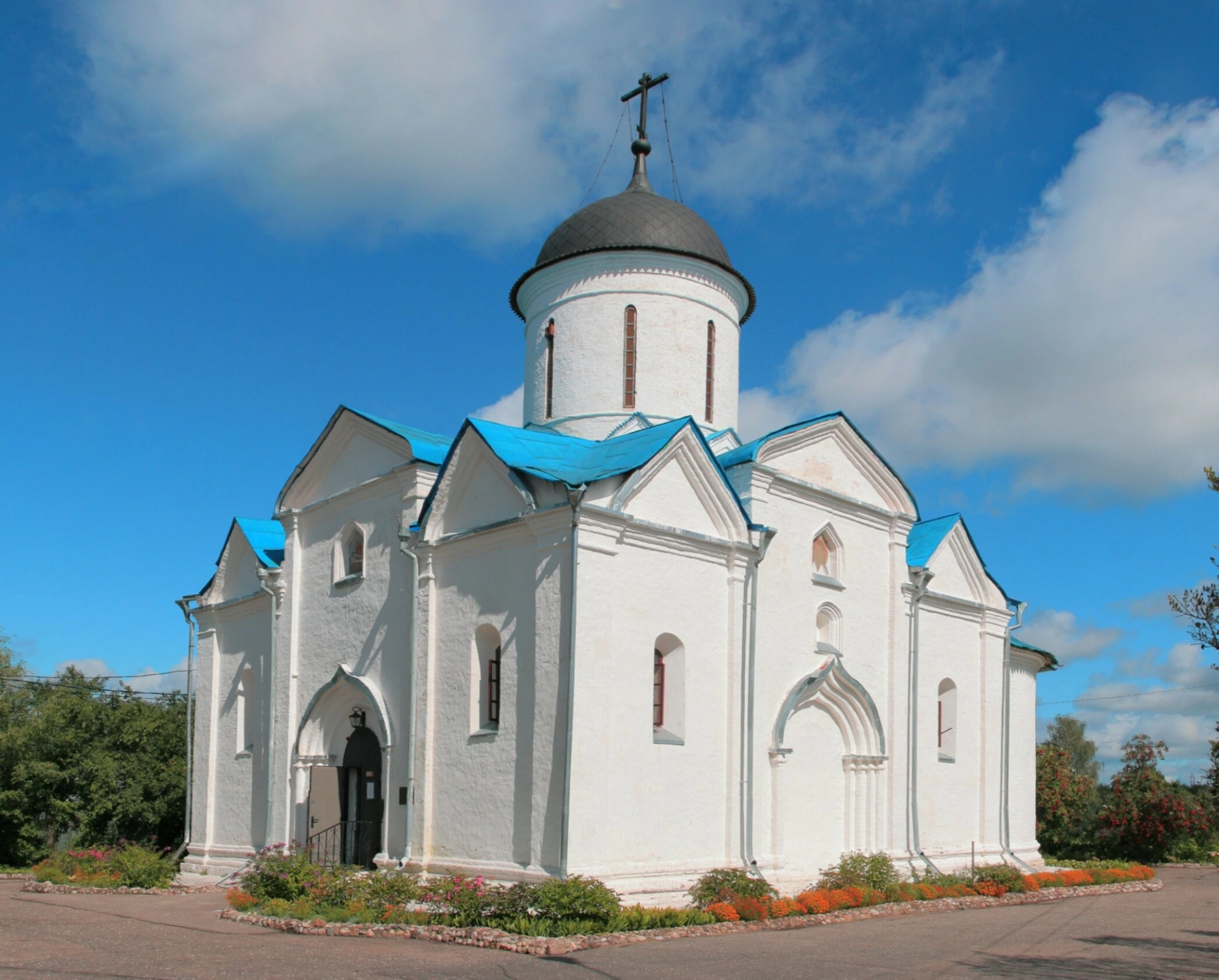 Храмовая постройка выдержана в каноническом русском стиле. Её стены, побеленные, словно свежим снегом, контрастируют с тёмными кровлями и лазурью небес. Композицию венчает высокая многоярусная колокольня, завершённая изящным серебристым шатром, на котором сияет золотой православный крест. На ярусе звонаря различима священная монограмма «ХВ», возвещающая о победе жизни над смертью.