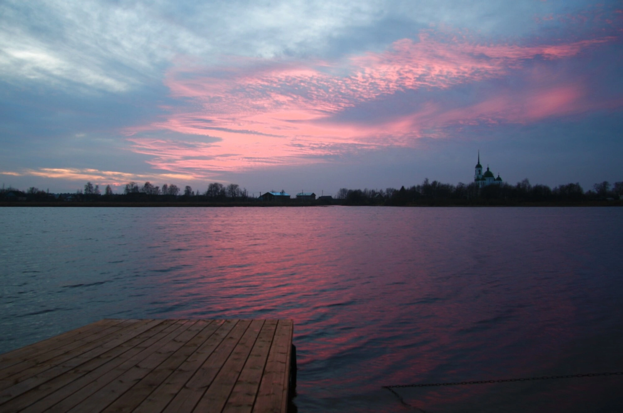 На представленной фотографии запечатлён величественный и умиротворяющий вид на закате, открывающийся с деревянного пирса на берегу Онежского озера в районе деревни Надкопанье Ленинградской области. Центральным элементом композиции, гордо возвышающимся на горизонте, является храм Рождества Христова, чей стройный силуэт с куполом и шпилем устремлён в небеса.