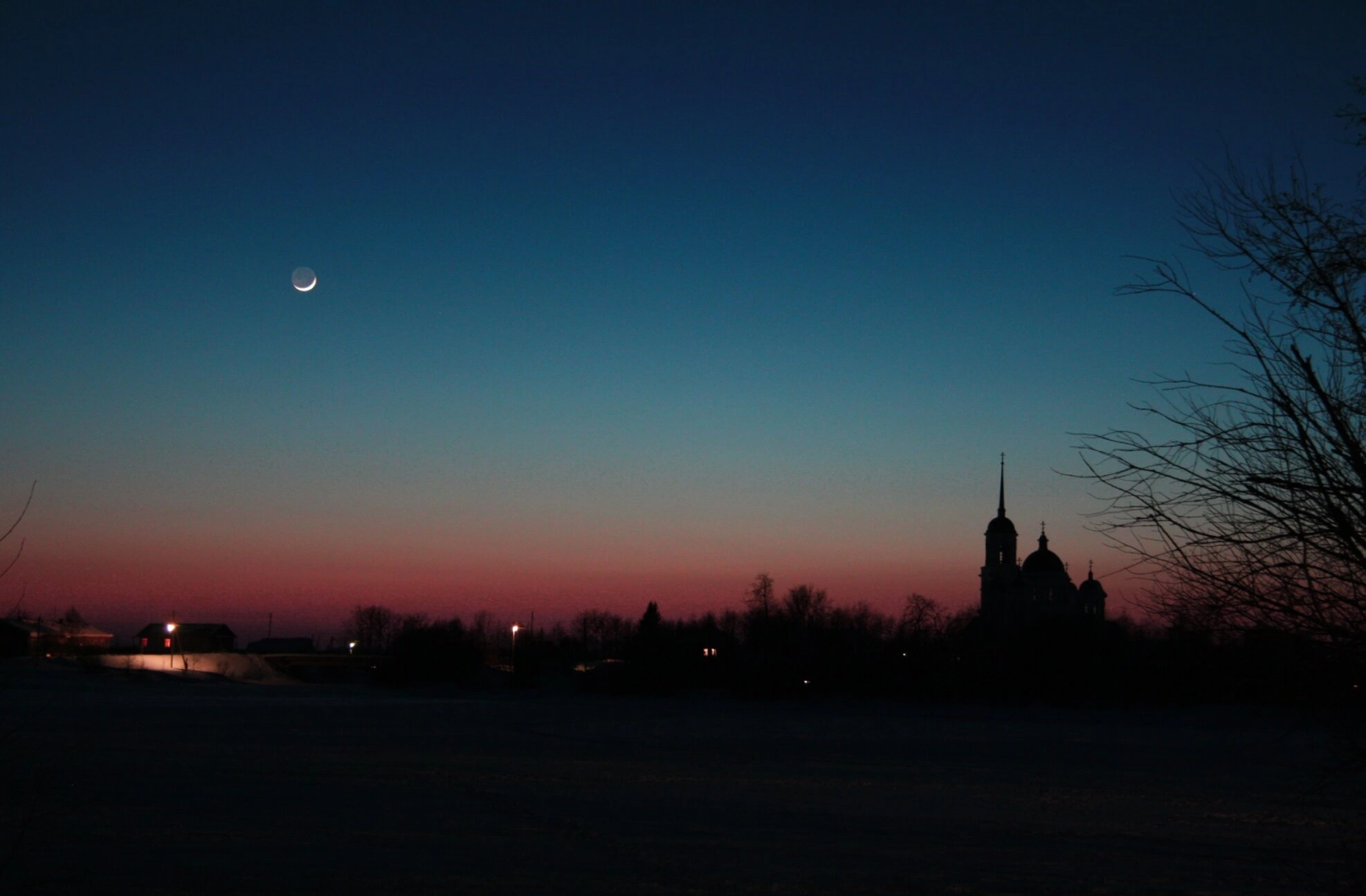 На представленной фотографии запечатлён величественный силуэт Храма Рождества Христова, расположенного в деревне Надкопанье Ленинградской области. Снимок сделан в умиротворённый час сумерек, когда небо на западе ещё хранит отблески угасшей зари, переливаясь оранжево-красными тонами, а в вышине уже властвует глубокий синий цвет наступающей ночи. Над линией горизонта низко парит молодой месяц, символизирующий собой обновление и Божие благословение.