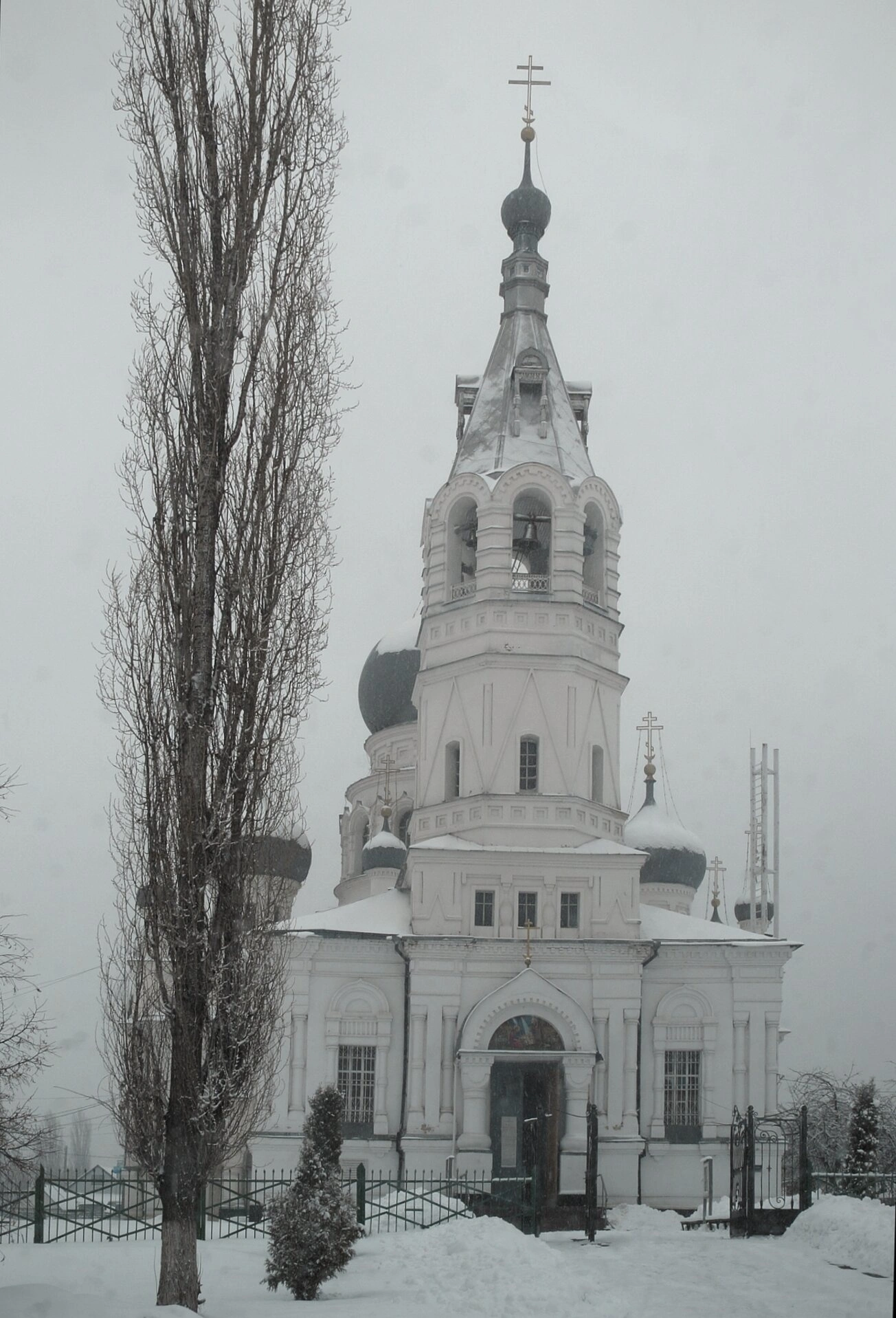 Территория вокруг церкви обнесена оградой, а на переднем плане виднеются голые ветви деревьев и хвойный кустарник, припорошённые снегом. Общая атмосфера снимка передаёт ощущение спокойствия, благочестия и незыблемости веры, что особенно ощутимо в тишине зимнего дня.
