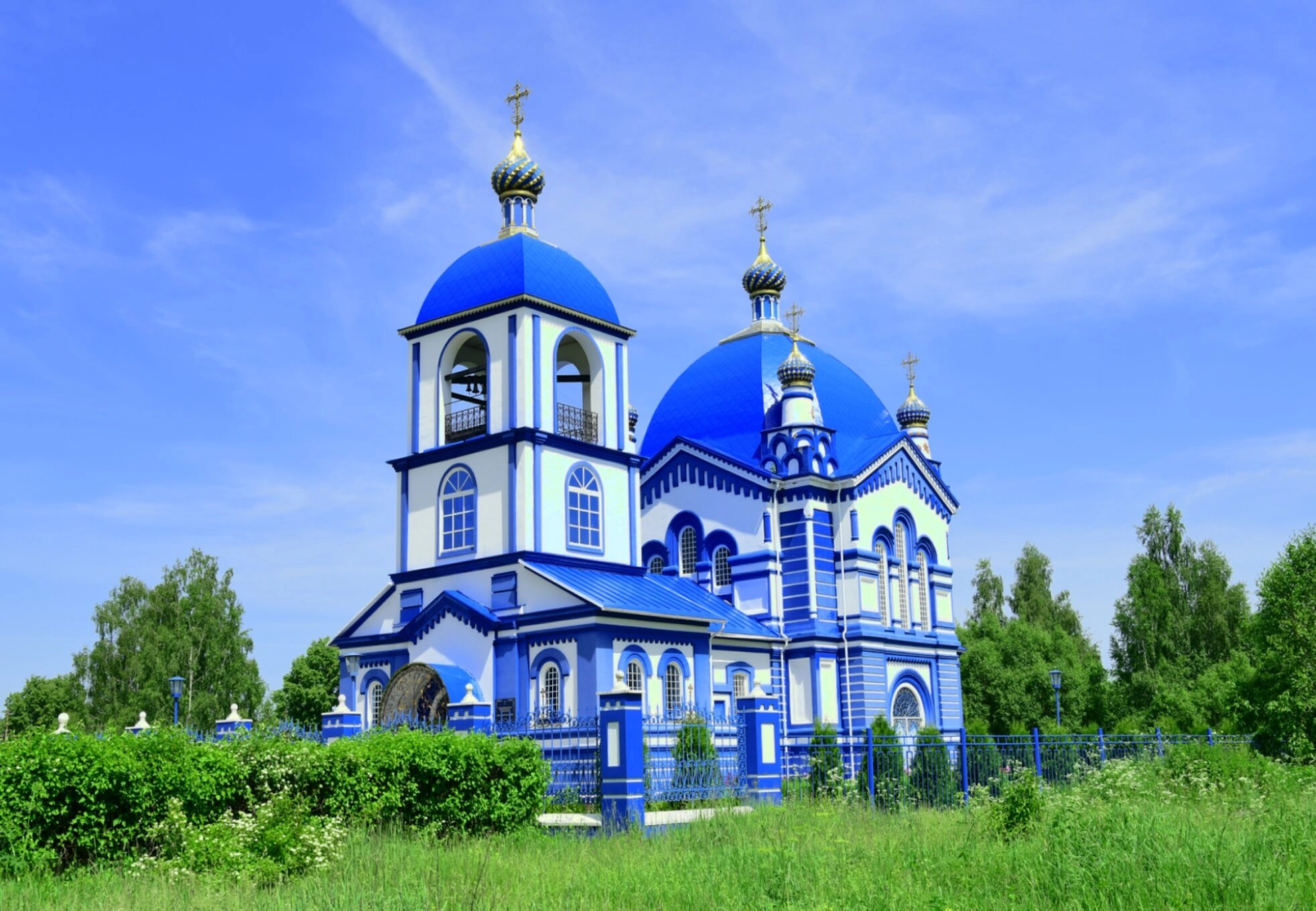Фотография передаёт спокойную и величавую красоту этого святого места, запечатлев его в ясный день. Храм изображён с такого ракурса, который позволяет оценить его монументальность и изящество архитектурных форм, гармонично вписанных в окружающий пейзаж. Снимок служит наглядным свидетельством сохранения православных традиций и красоты русской духовной культуры.