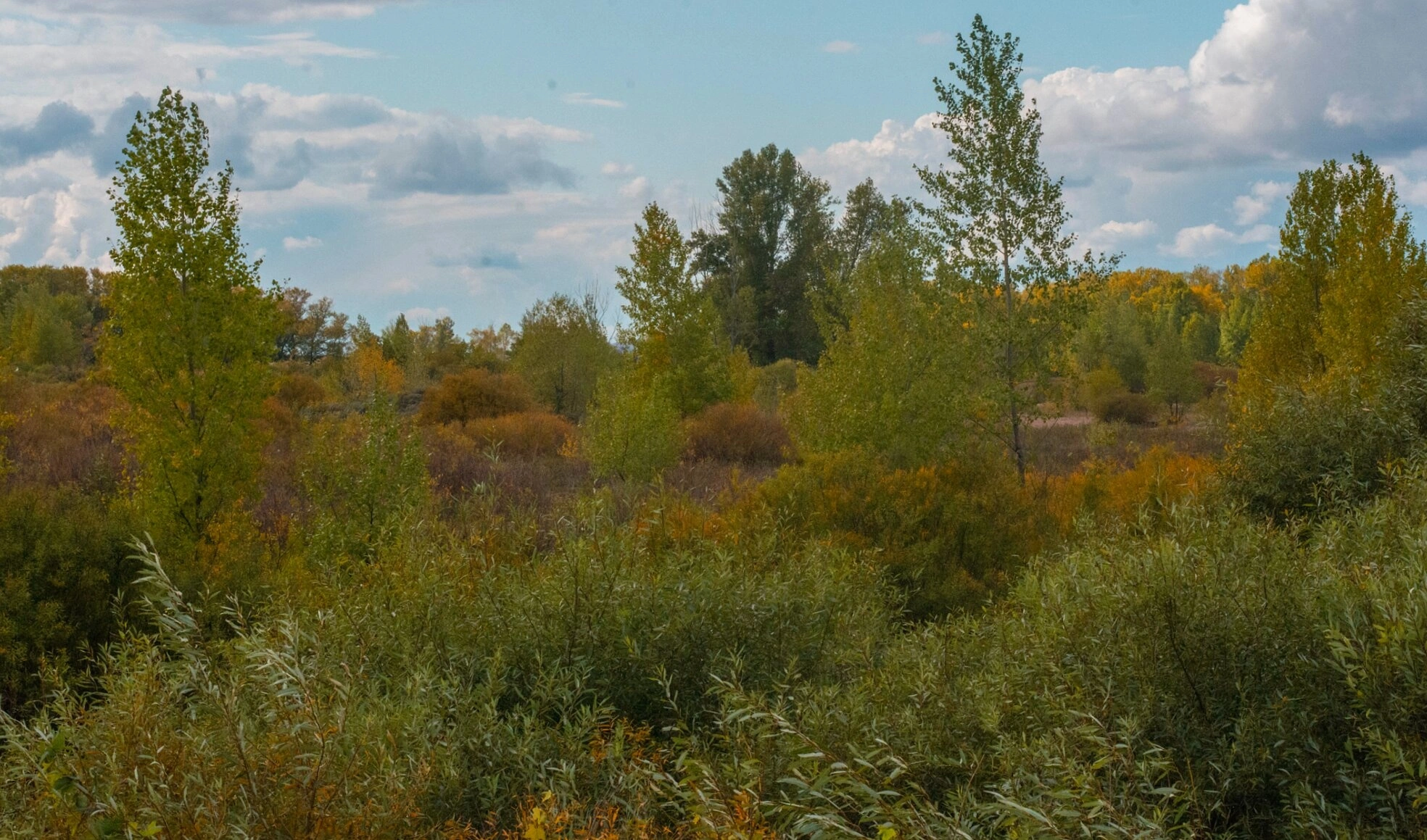В центральной части кадра возвышаются деревья, облаченные в золотисто-желтый осенний наряд, что создает особую атмосферу благоговения и умиротворения. По сторонам и на переднем плане разместились кустарники и разнотравье, сохраняющие последние следы уходящего лета. Небесная гладь, частично покрытая легкими облаками, мягко освещает всю композицию, наполняя ее божественным светом.
