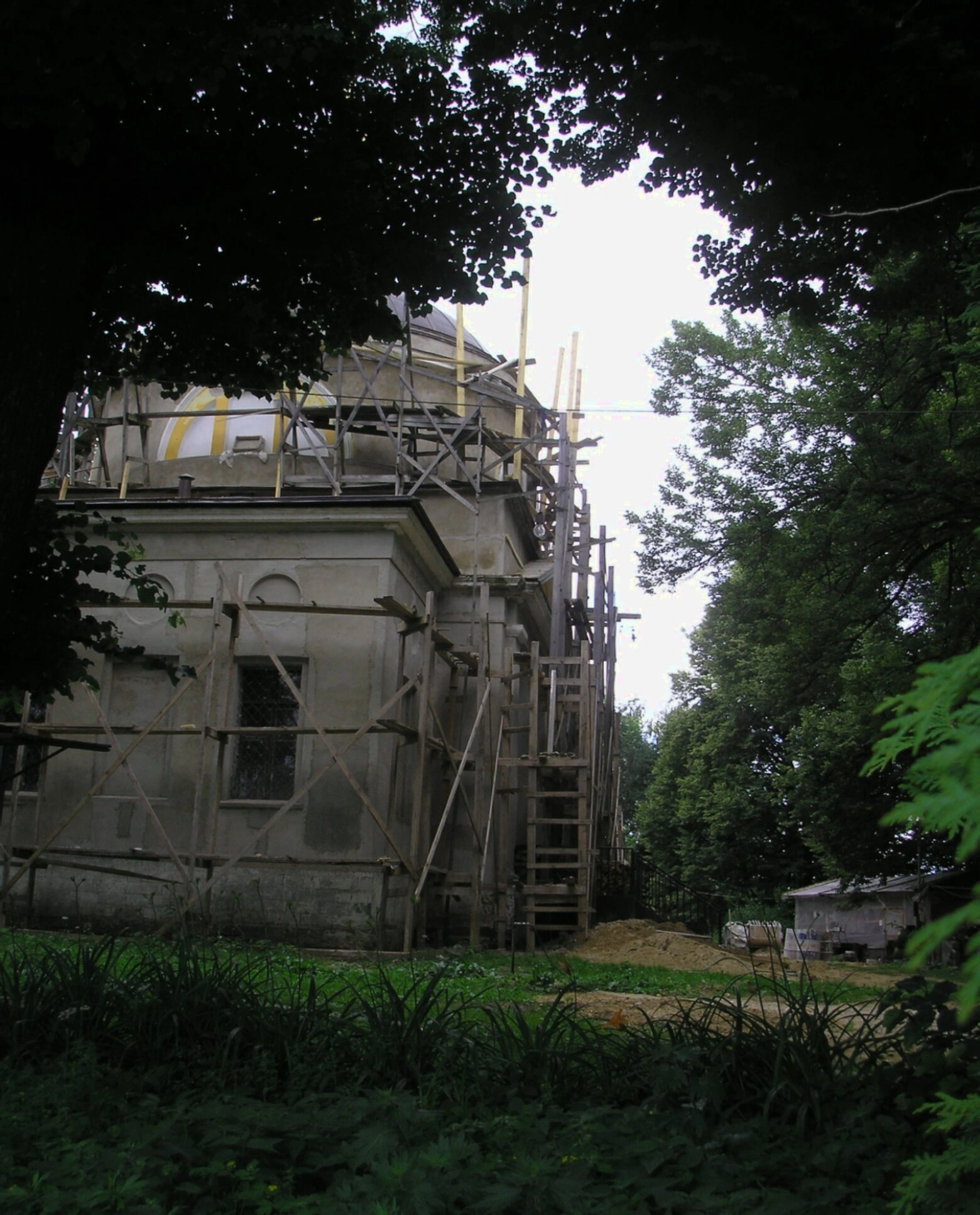 На представленной фотографии запечатлён Христорождественский храм, освящённый в честь Рождества Христова, что располагается в древнем селе Рождествено городского округа Истра Московской области. Святыня, чьи купола устремляются в небесную высь, переживает период благоговейного восстановления, о чём красноречиво свидетельствуют аккуратно установленные строительные леса.
